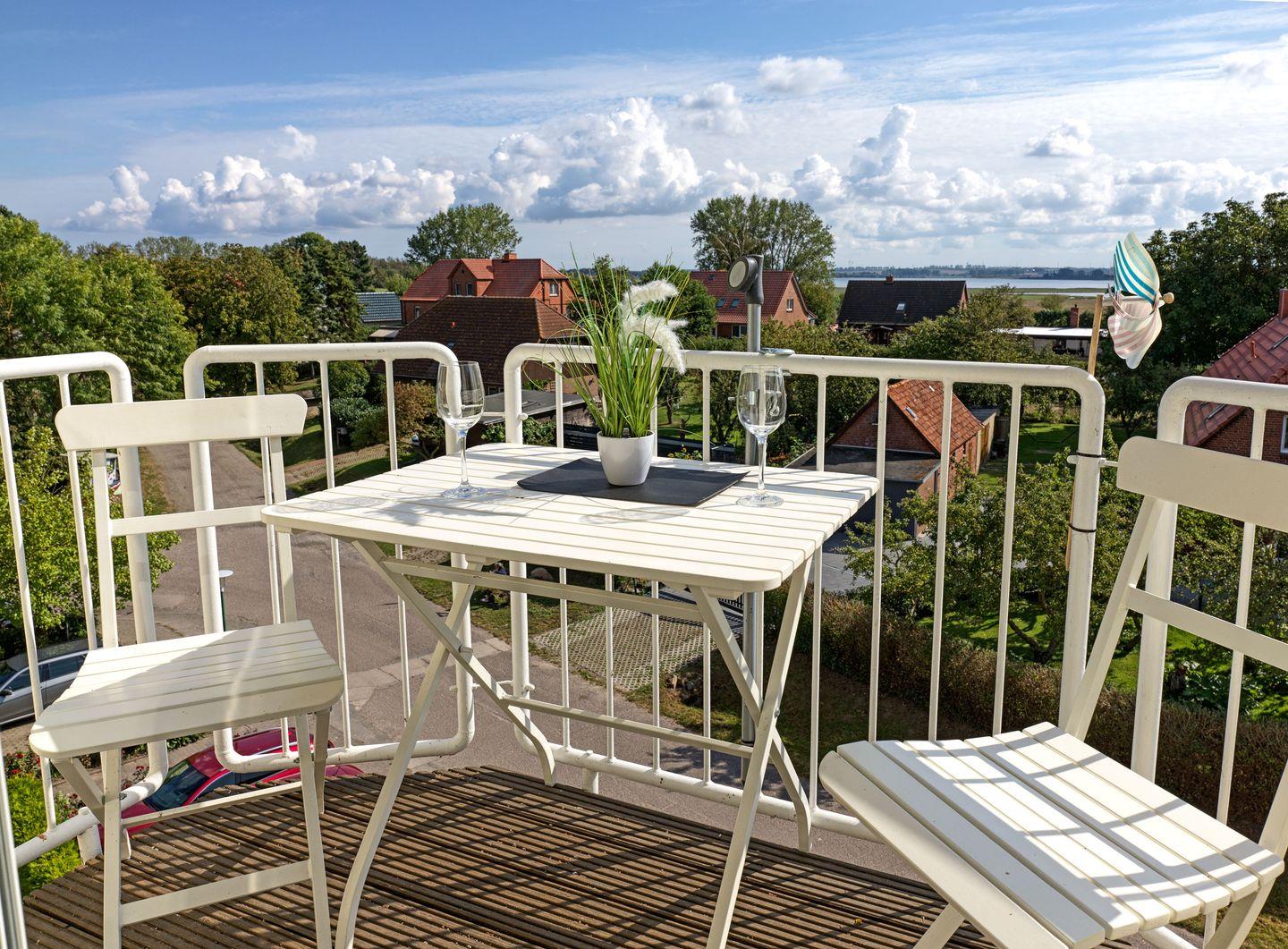 Schöne Ferienwohnung im 3. OG. Der gemütliche Wohnbereich mit Couchecke verfügt über einen TV/HiFi und Balkon mit Gartenmöbeln. Von hier schauen Sie auf die Felder von Gollwitz und in einer kleinen Entfernung können Sie auch das Meer sehen. Die offene Einbauküche ist mit Mini-Geschirrspüler, Mikrowelle, Kühlschrank, 2-Platten-Ceranfeld, Kaffeemaschine, Wasserkocher, Toaster ausgestattet. Im Küchenbereich integriert ist der Essbereich (erhöhter Tisch mit erhöhten Stühlen). Bad mit Dusche/WC. Im Dachgeschoss befindet sich das Schlafzimmer mit Doppelbett in Komforthöhe für 2 Personen mit TV (begehbar über eine schmale Raumspar-Treppe). Die gesamte Wohnung ist mit einer Fußbodenheizung ausgestattet.