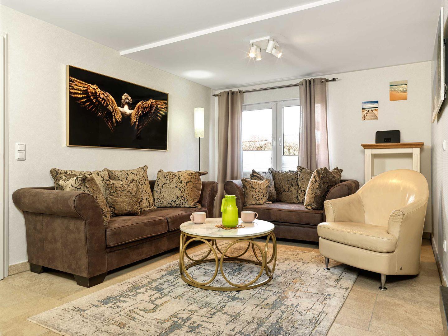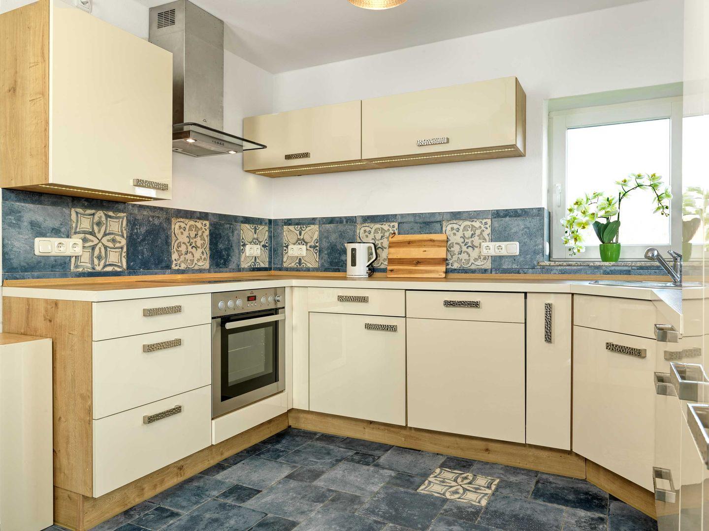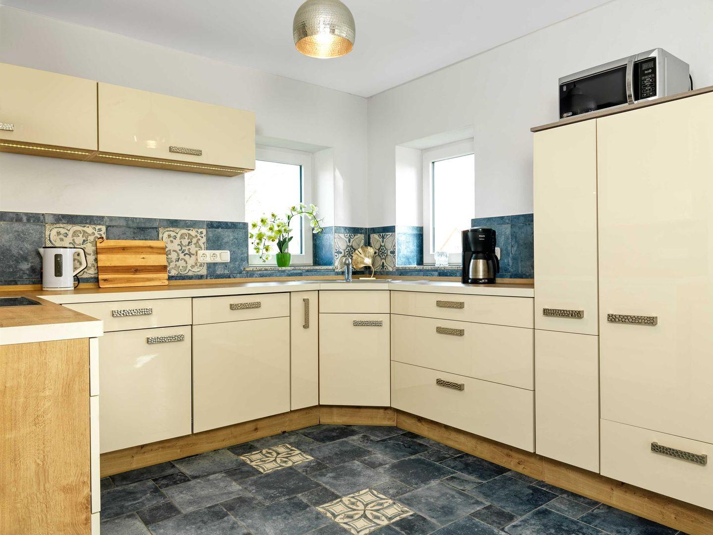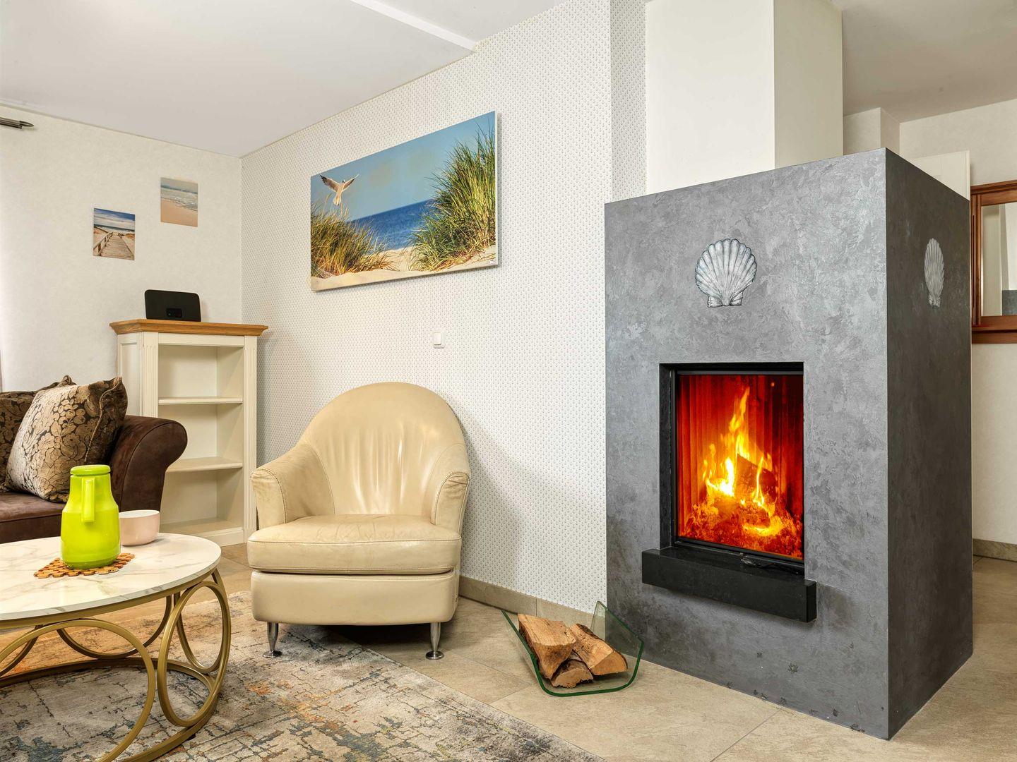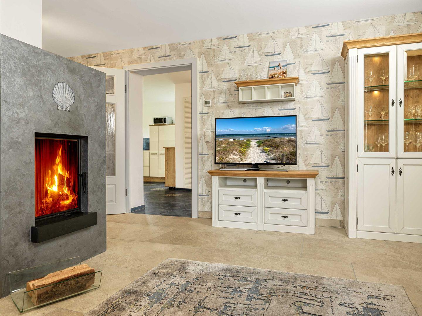 Das große Wohnzimmer mit TV, Couchecke und gemütlichem Kamin bietet ausreichend Platz für eine kuschelige Familienzeit. Die anschließende Küche mit Mikrowelle, Herd/Backofen, Kühlschrank, Essbereich und vielem mehr macht Ihren Urlaub zu etwas Besonderem.