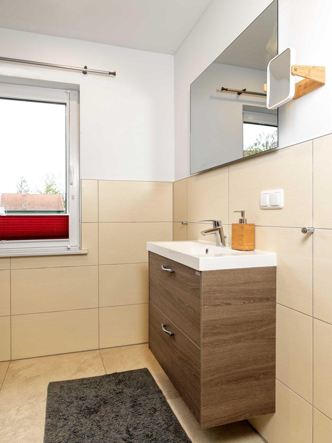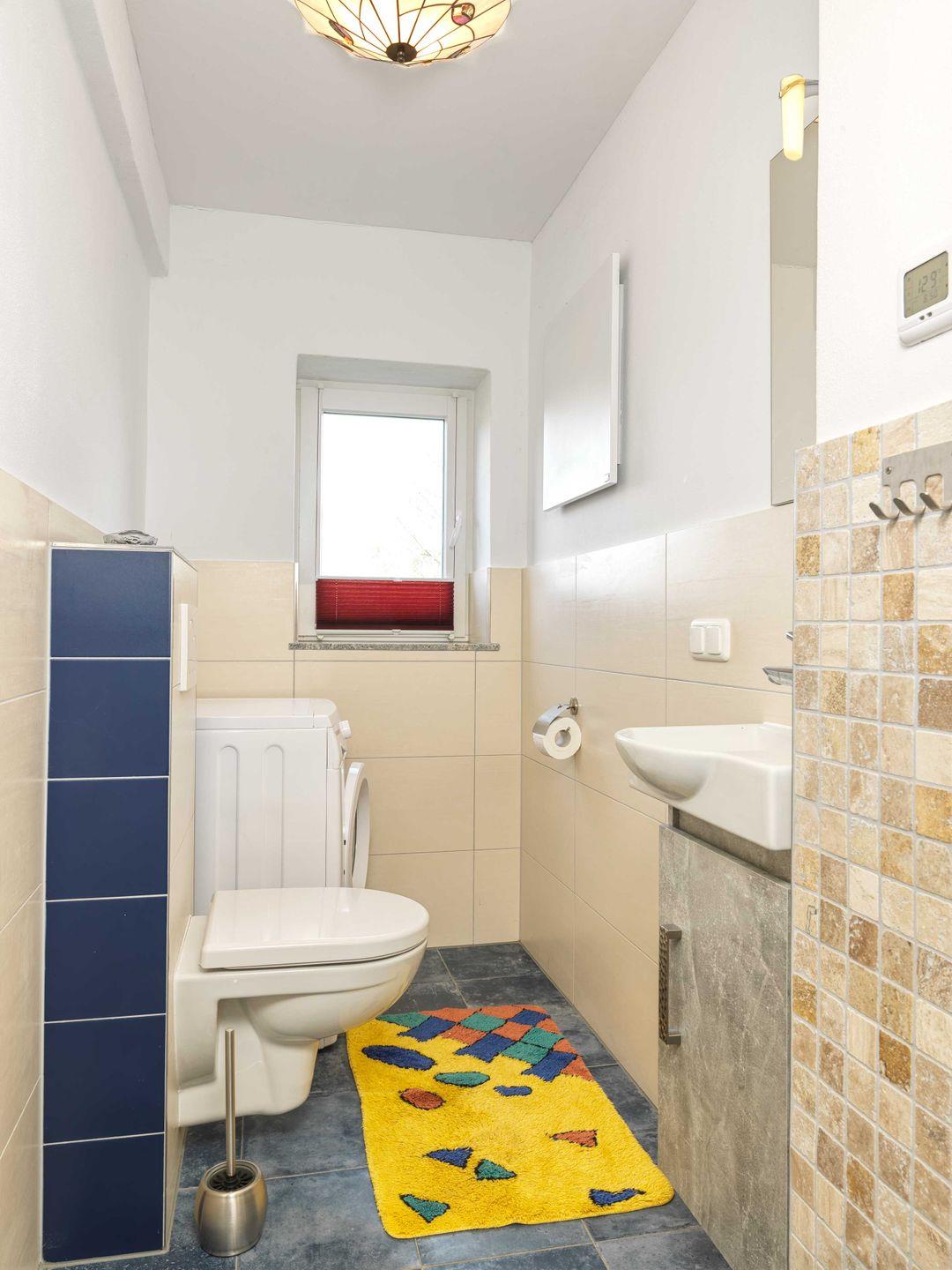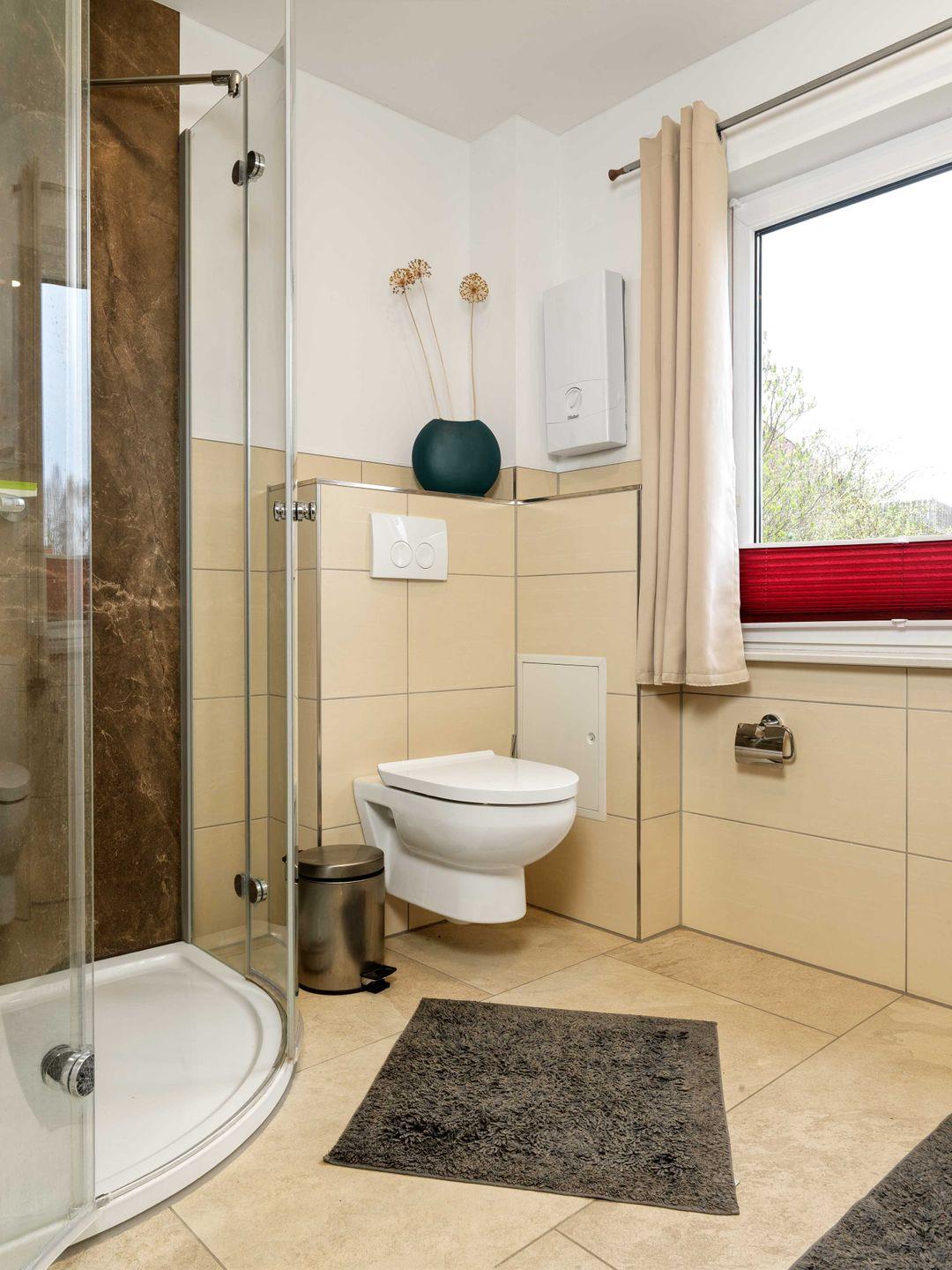 Es erwartet Sie ein Bad mit WC/Dusche, Fußbodenheizung und Fenster, sowie zusätzlich ein Gäste-WC!