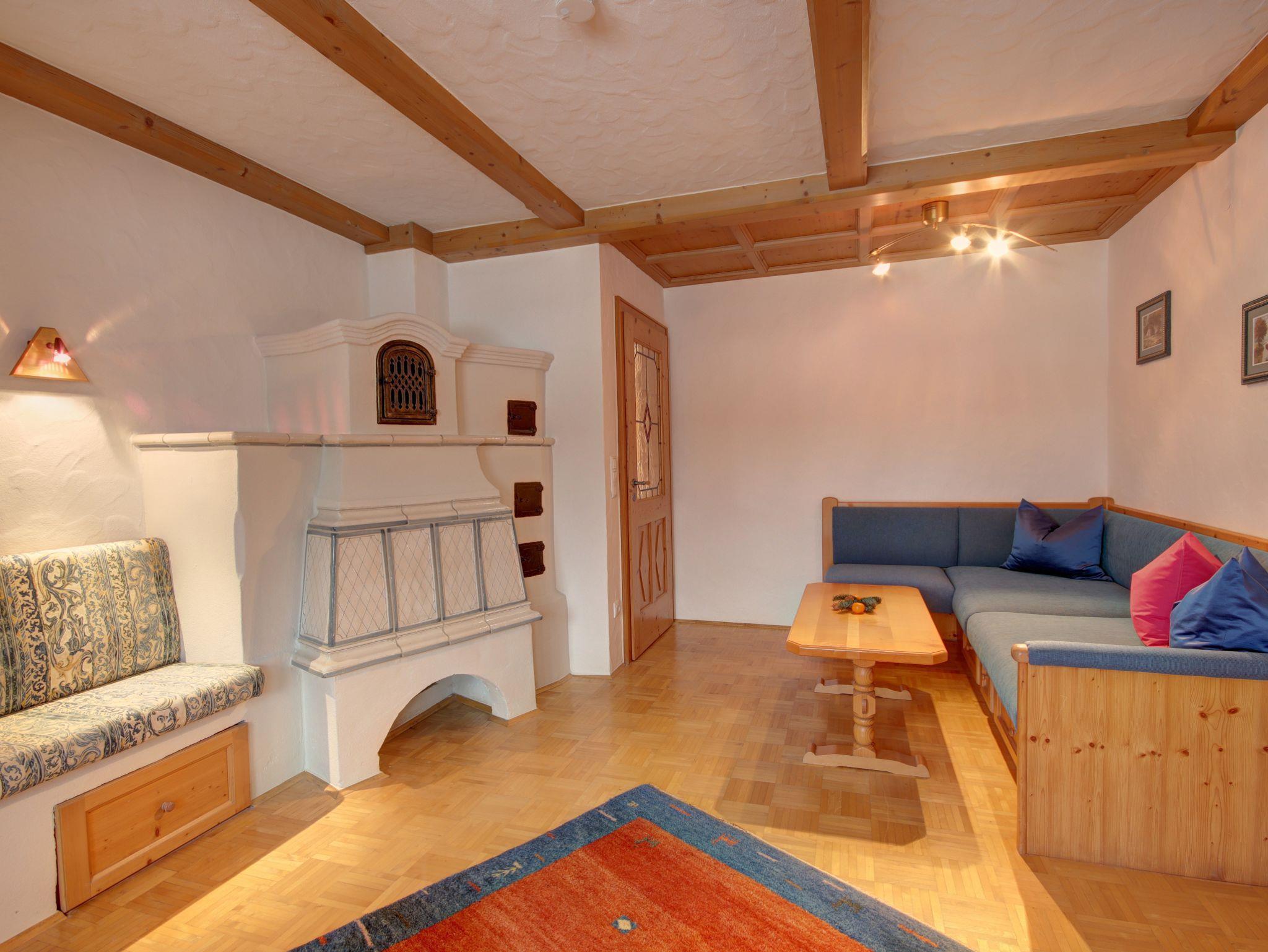 Wohnzimmer mit großer Eckcouch und Kachelofen, Flachbild-TV,