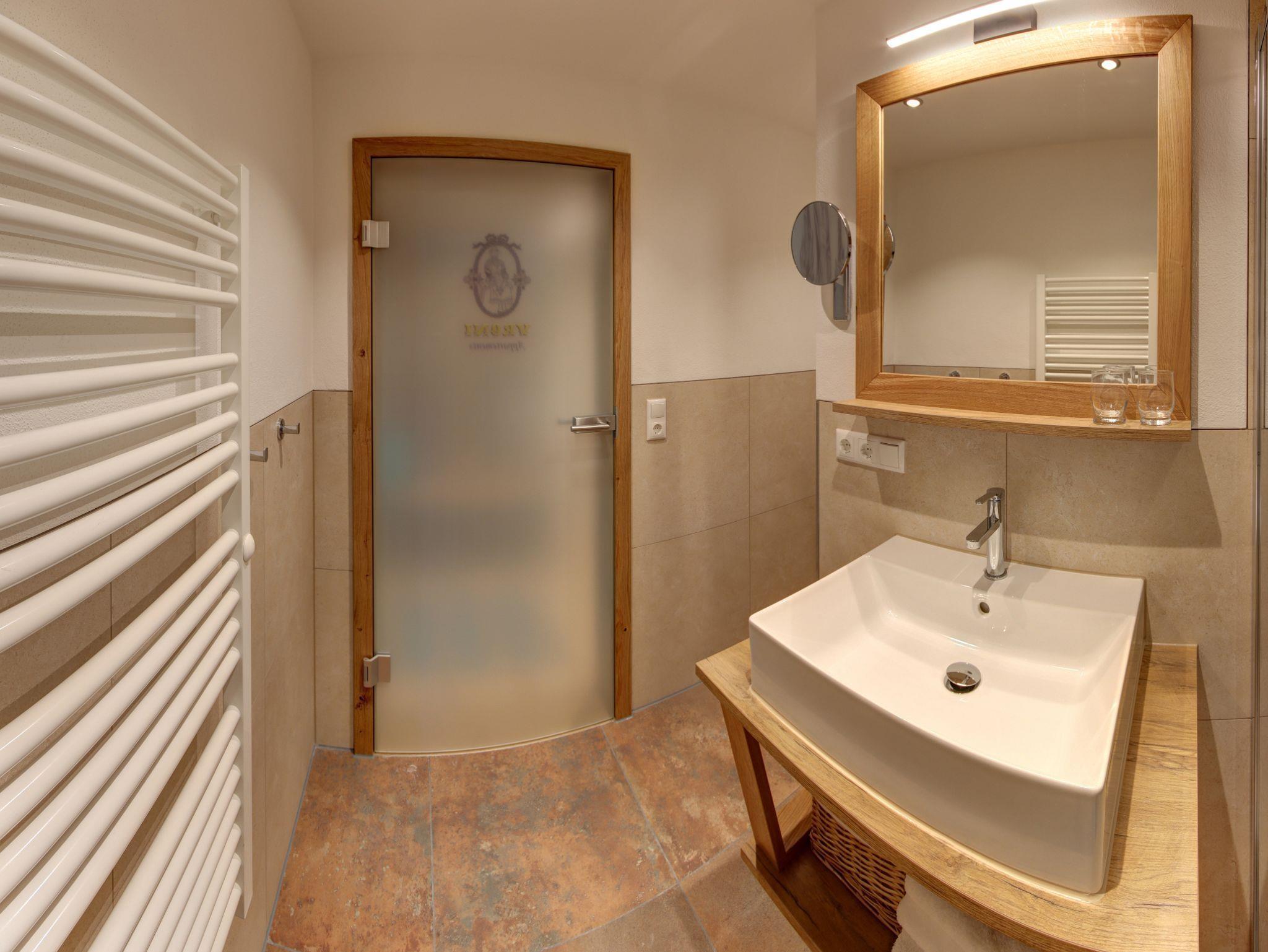 Badezimmer mit Glasdusche, Kosmetikspiegel, Handtuchtrockner, Föhn