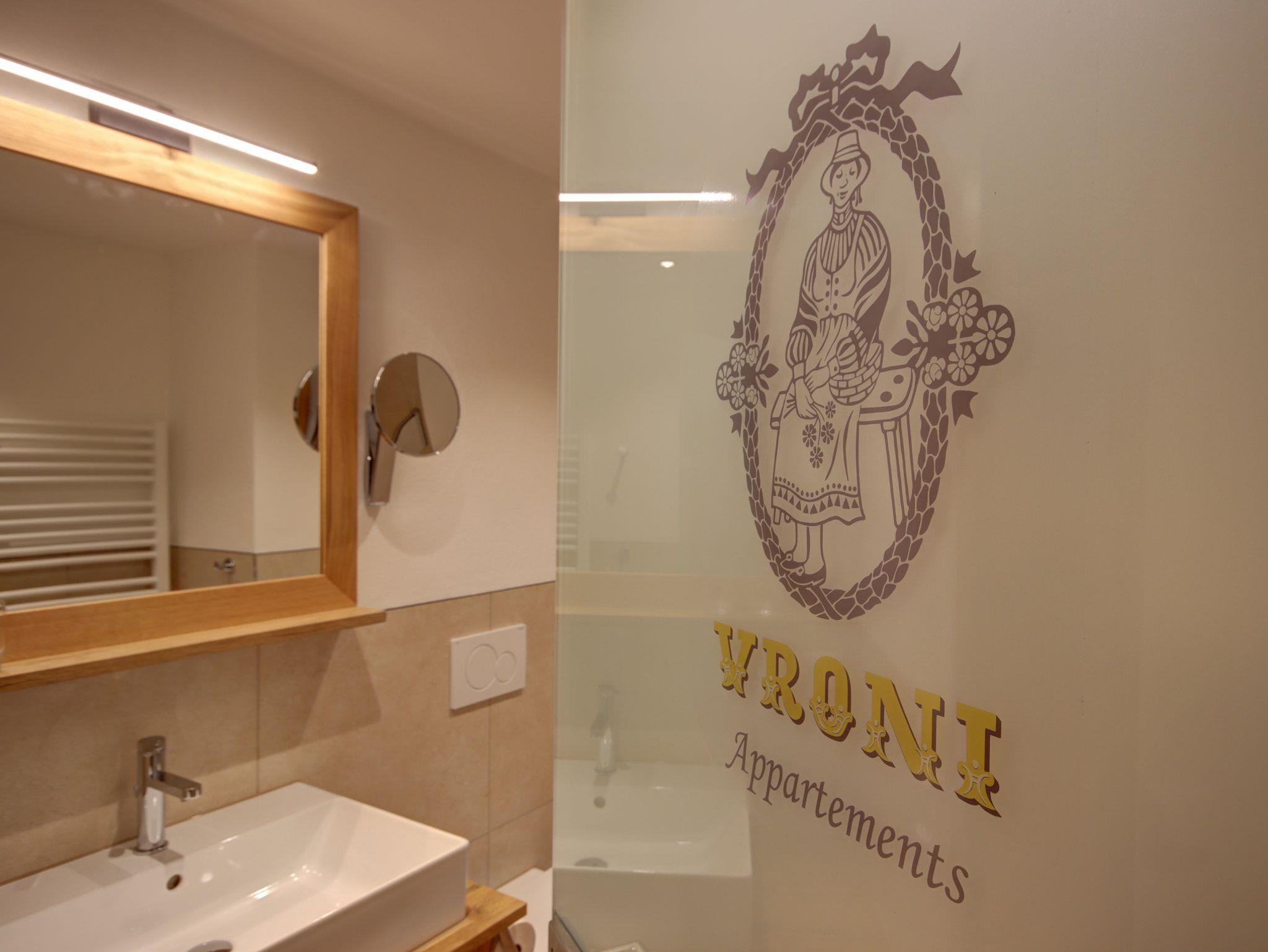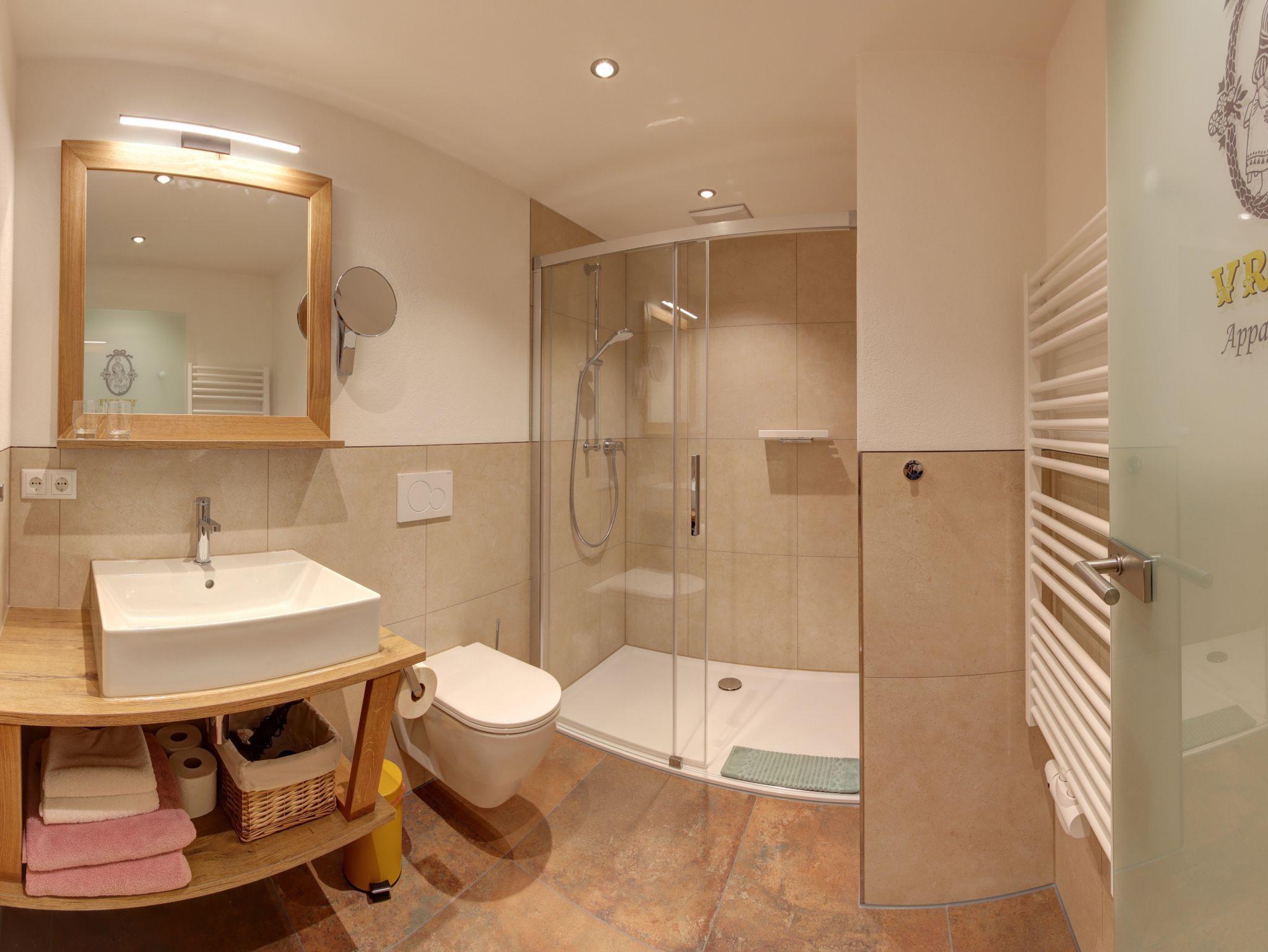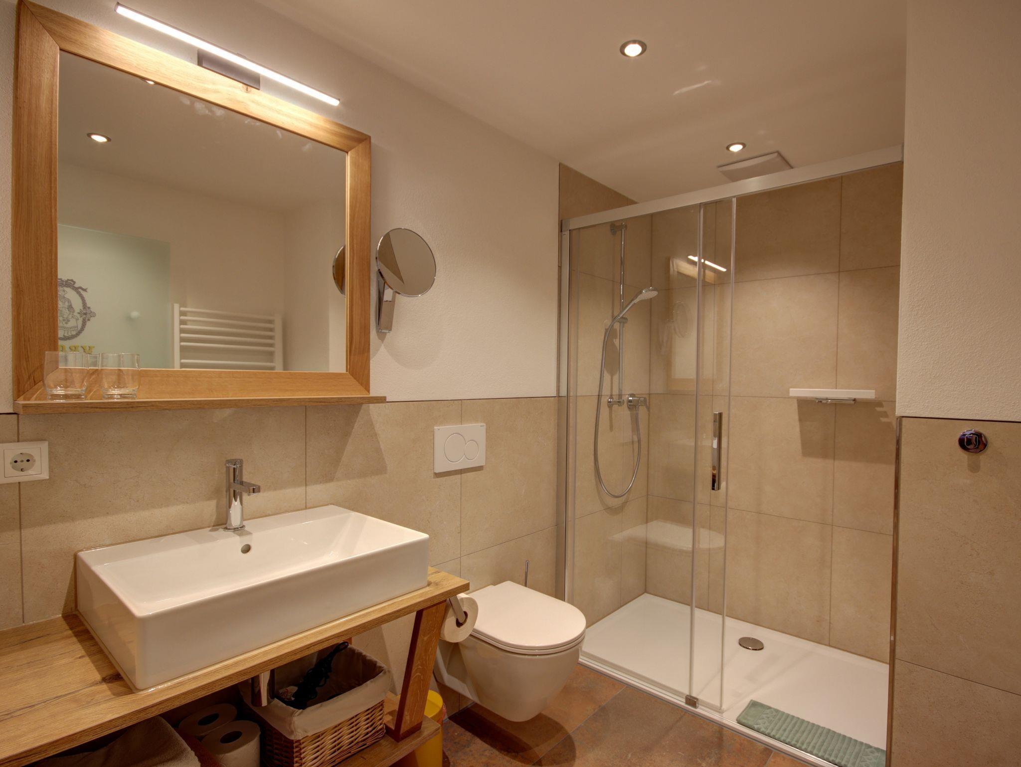 Badezimmer mit Glasdusche, Kosmetikspiegel, Handtuchtrockner, Föhn