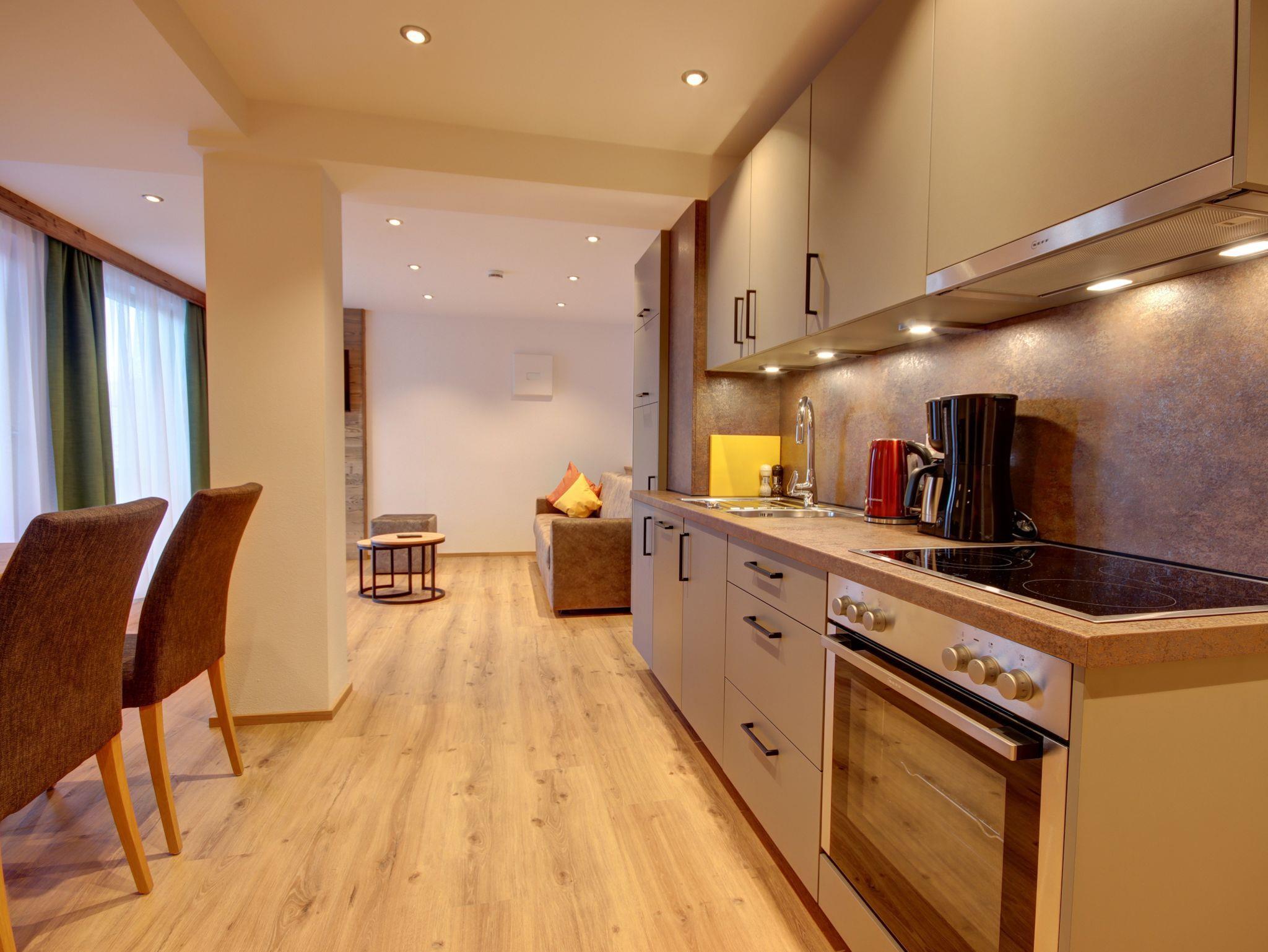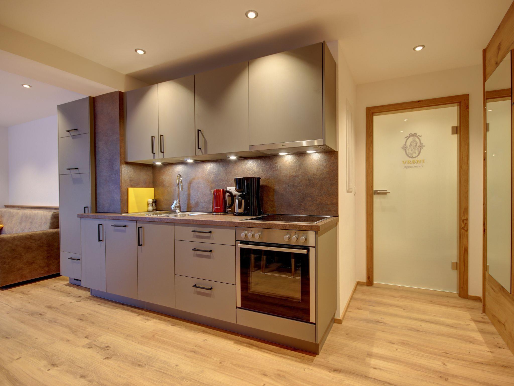 Küchenbereich ausgestattet mit Ceranfeld-Herd, Dunstabzug, Backofen, Kühlschrank mit Gefrierfach, Geschirrspüler, Toaster, Eierkocher, Wasserkocher, Töpfe, Teller, Besteck, usw.