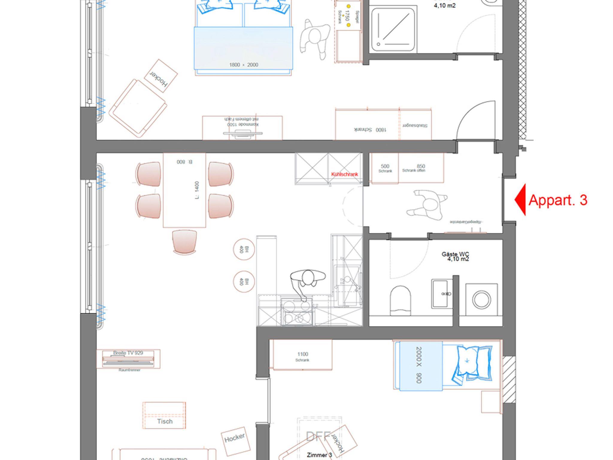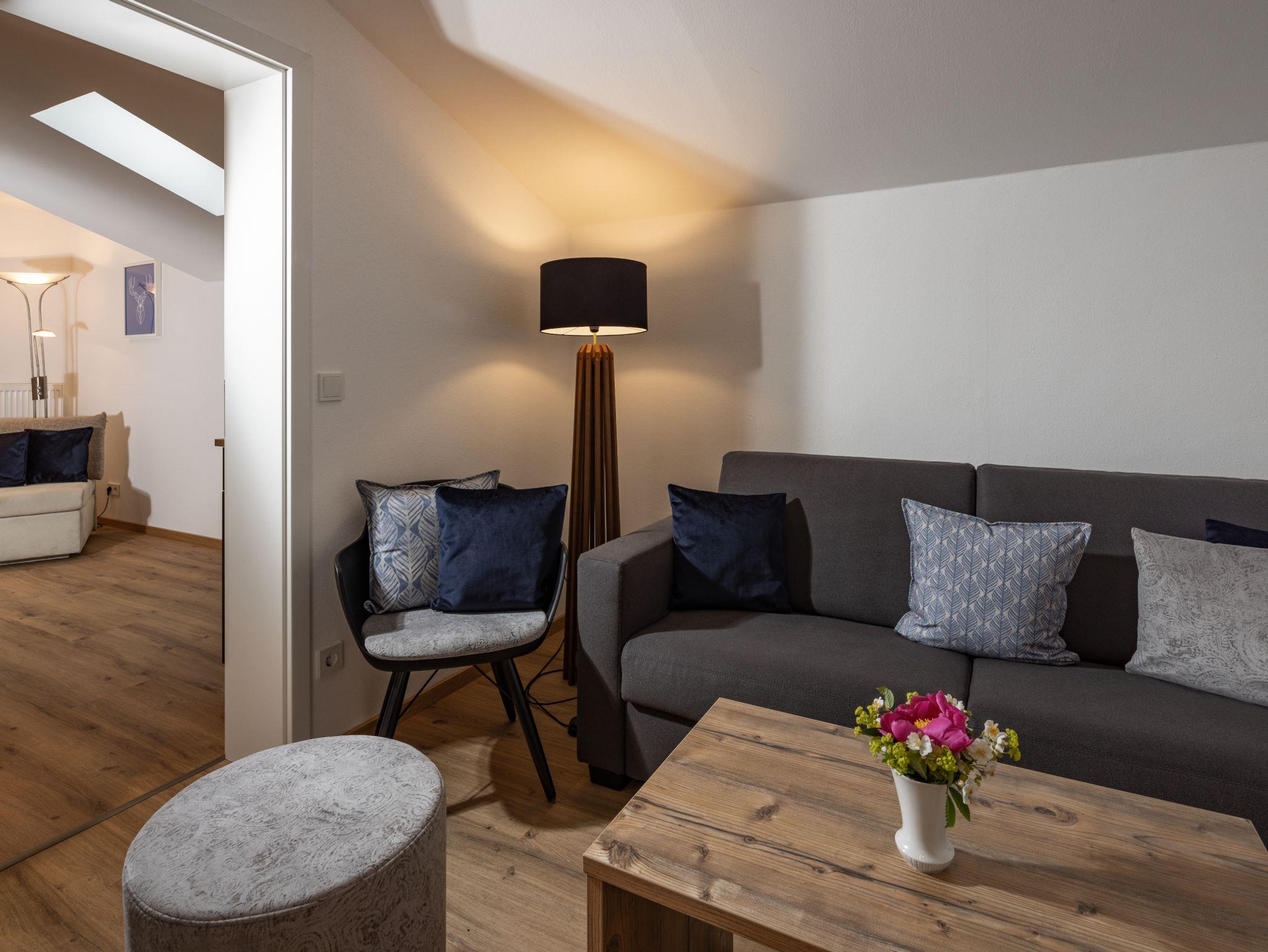 Appartement 3 „Hochfelln“ / 1.OG3-Zimmer – DU/WC – + separates Gäste WC2 Personen (+1 oder +2)Ca.72m²1 großer WestbalkonWohnzimmer/TV/Schlafcouch (150x195) mit Essbereich und Küche komplett ausgestattet (mit Theke und Thekenhocker, Herd, Backofen, Spülmaschine, Kühlschrank, Kaffee-u. Espressomaschine, Milchaufschäumer, Wasserkocher) – zum großen WestbalkonSchlafzimmer/TV, Boxspringbetten 2x 90x200 – zum großen WestbalkonSeparates Zimmer/TV, Boxspringbett 1x 90x200, Schlafsessel (90x200), Dachfenster