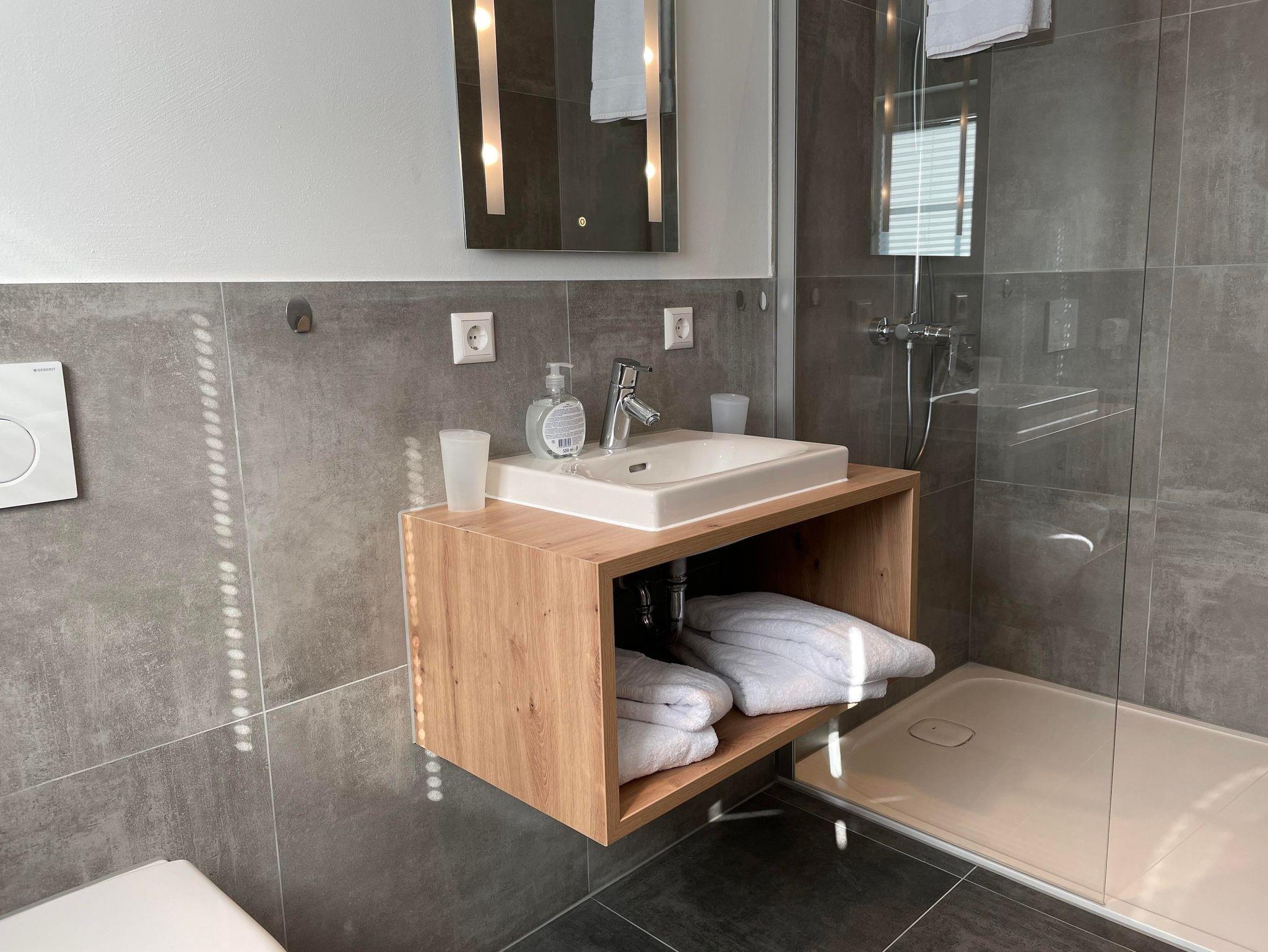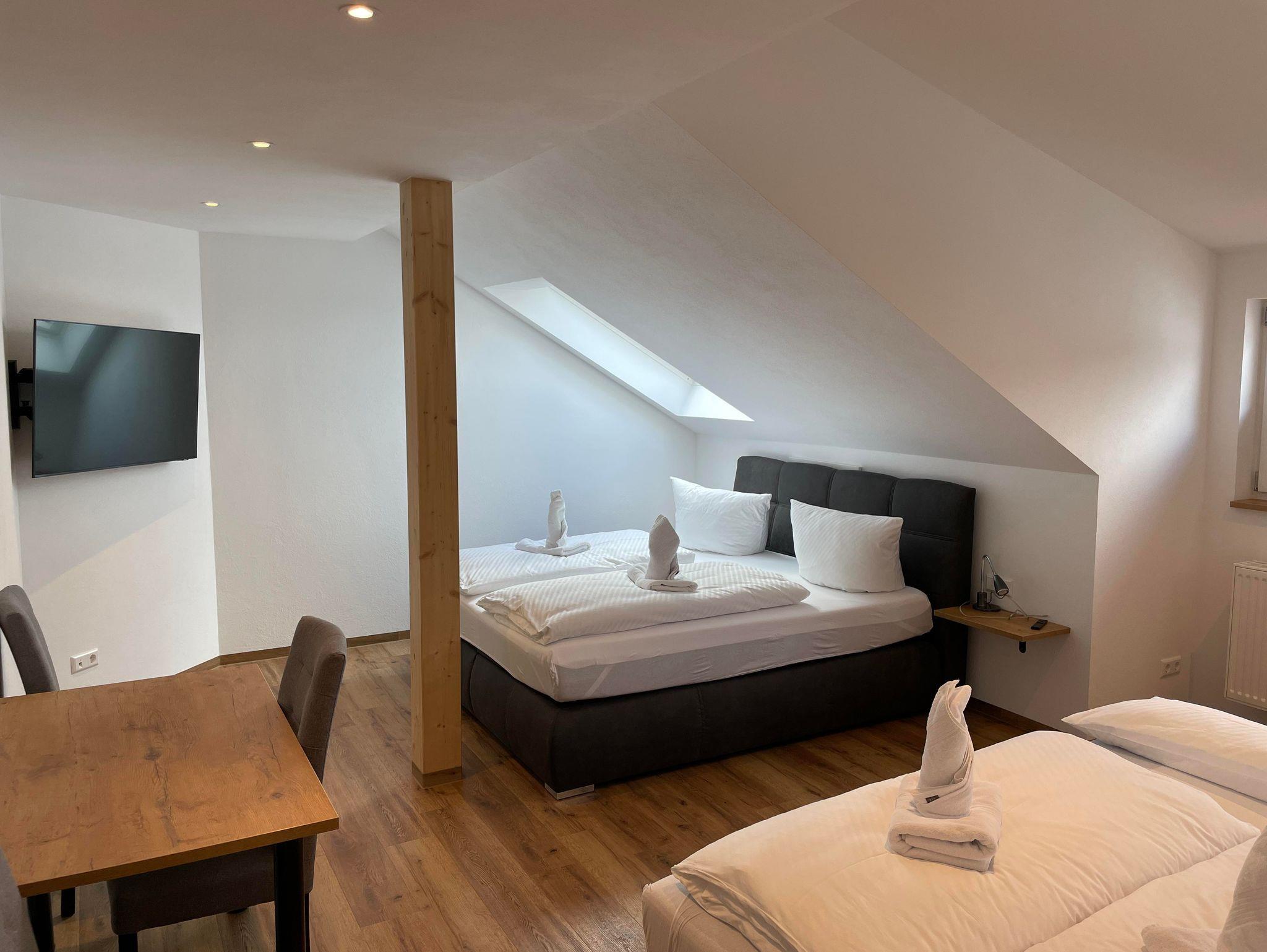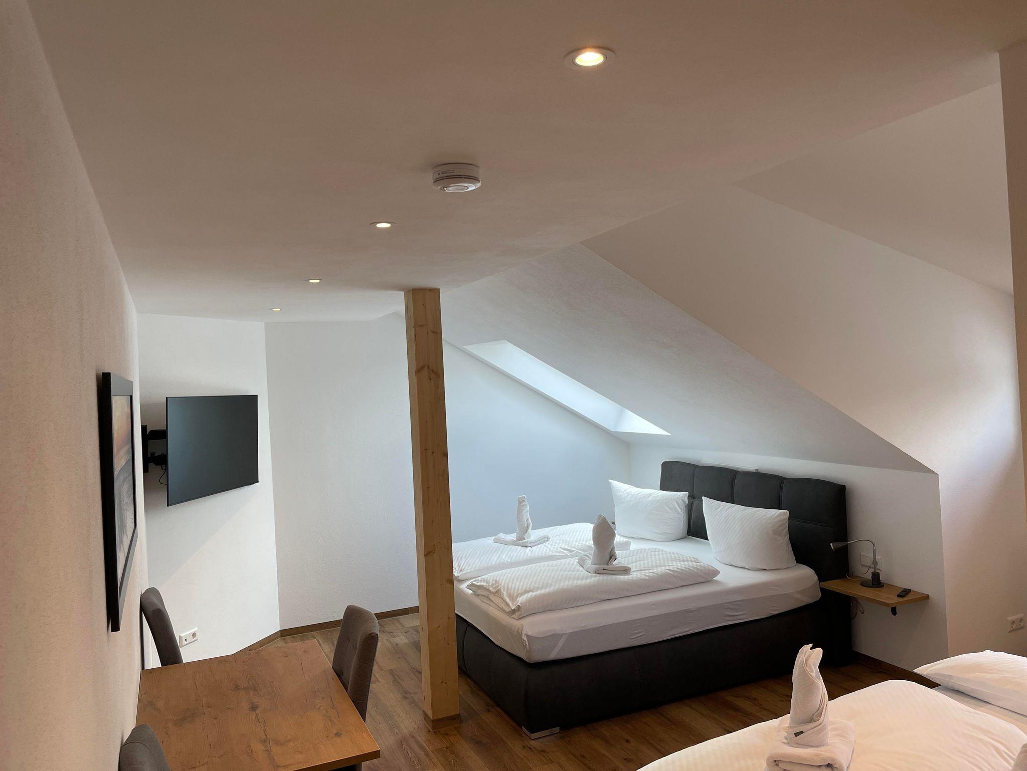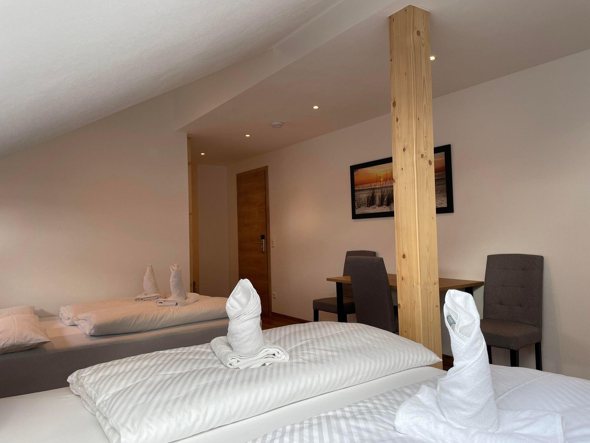 Modern und neu. Unser Superior Zimmer mit Boxspringbett, Schlafcouch, TV, Bad/WC mit begehbarer Dusche, Tisch, freies W-LAN