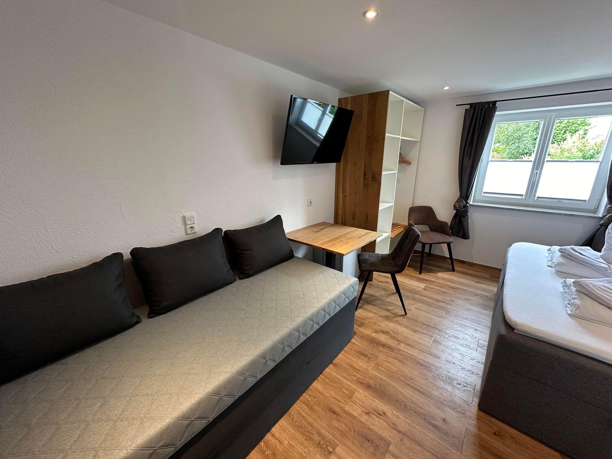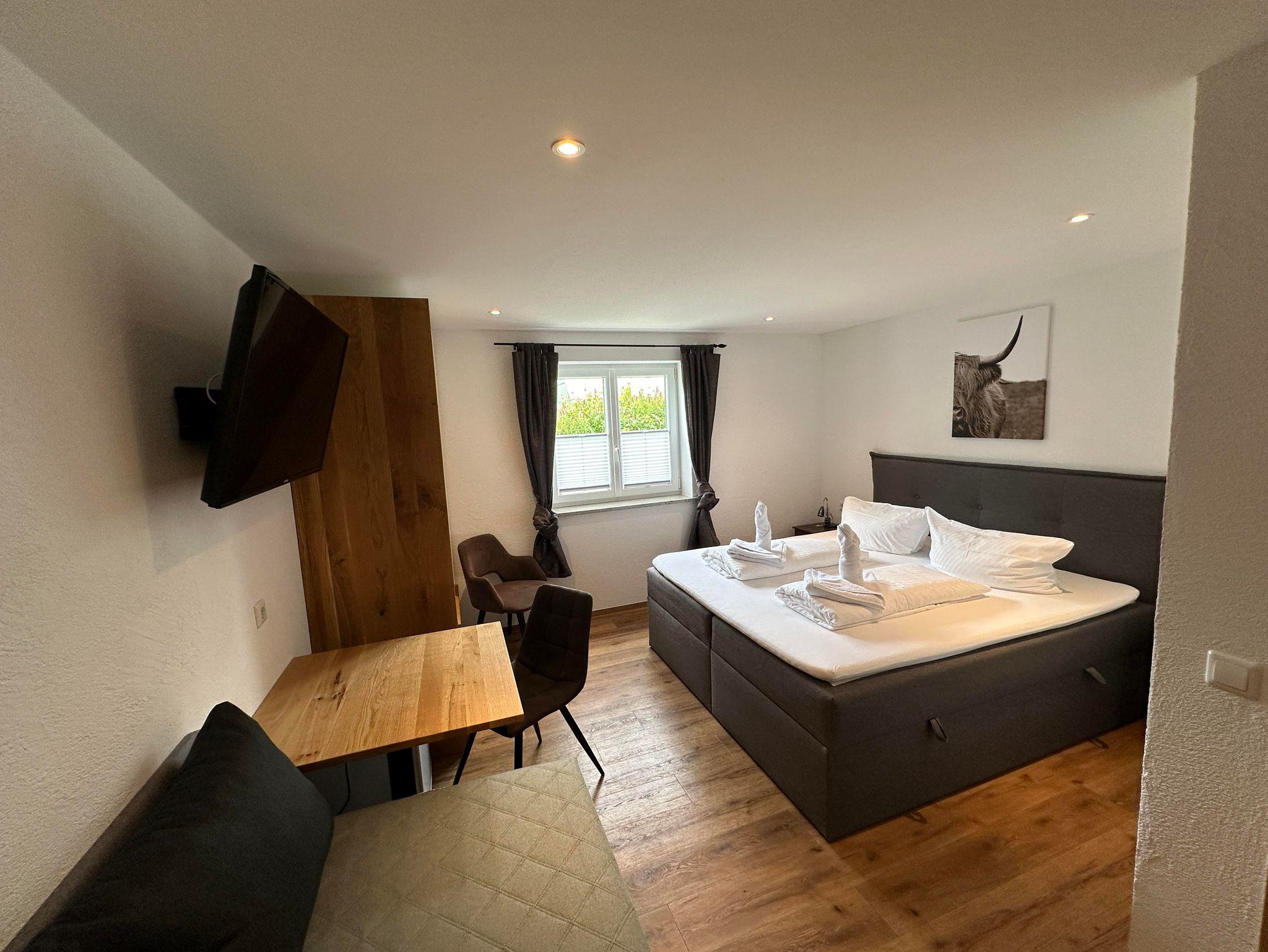 Ruhiges Doppelzimmer mit Dusche und WC, Radio, TV, Tisch, Erdgeschoss.