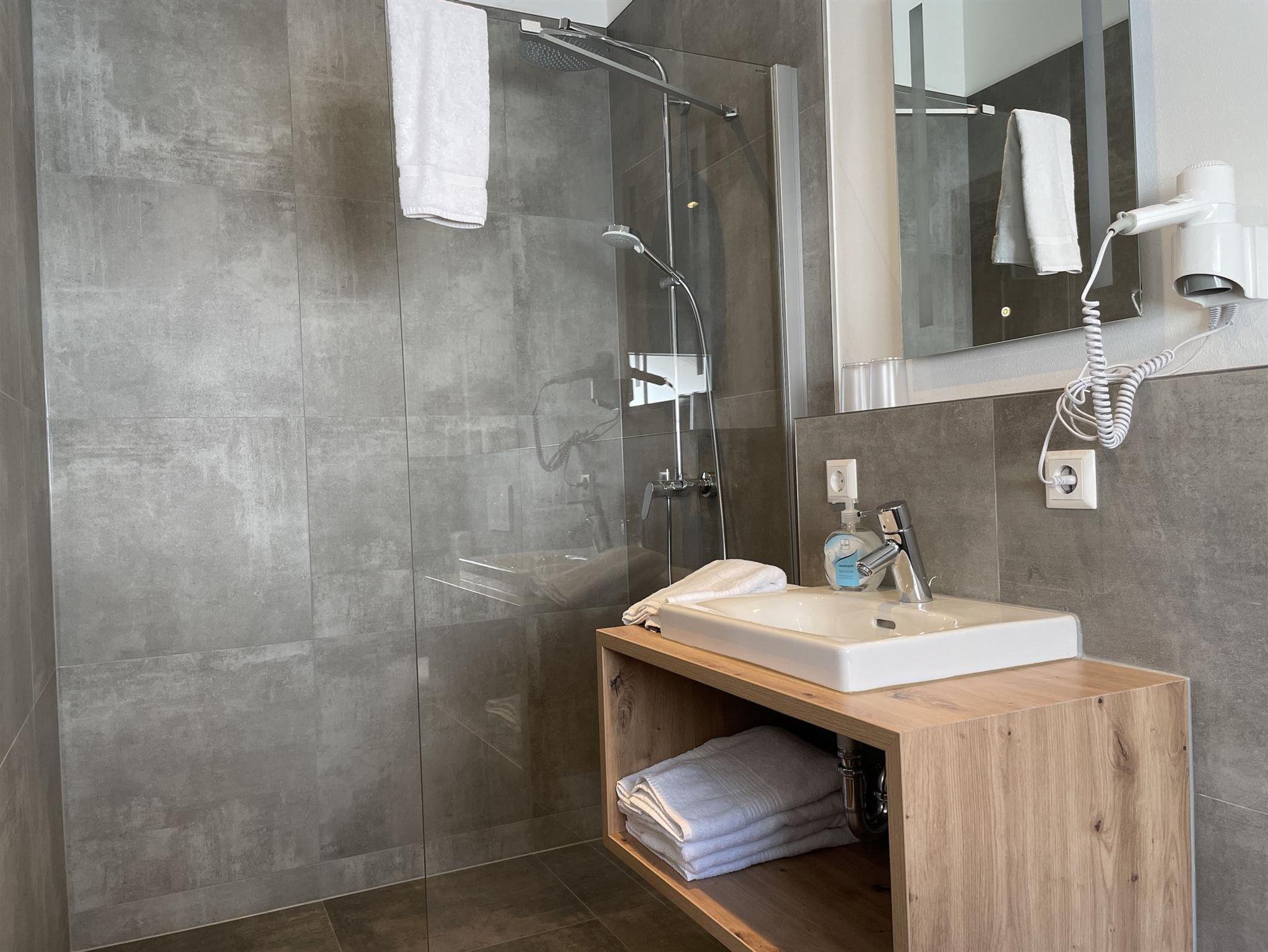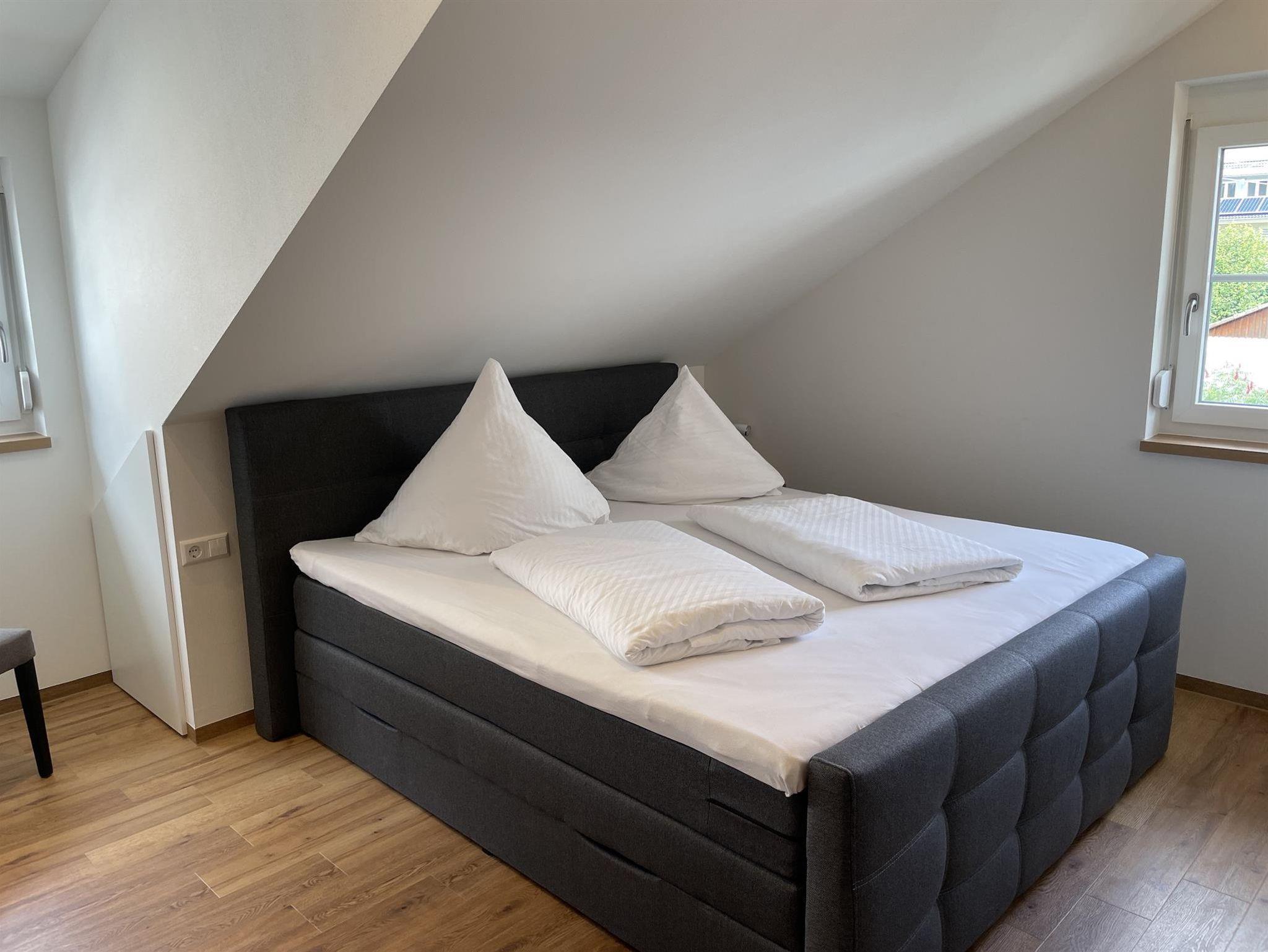 Ruhiges, neues Doppelzimmer mit Boxspringbett, TV, Bad/WC mit begehbarer Dusche, Tisch, freies W-LAN