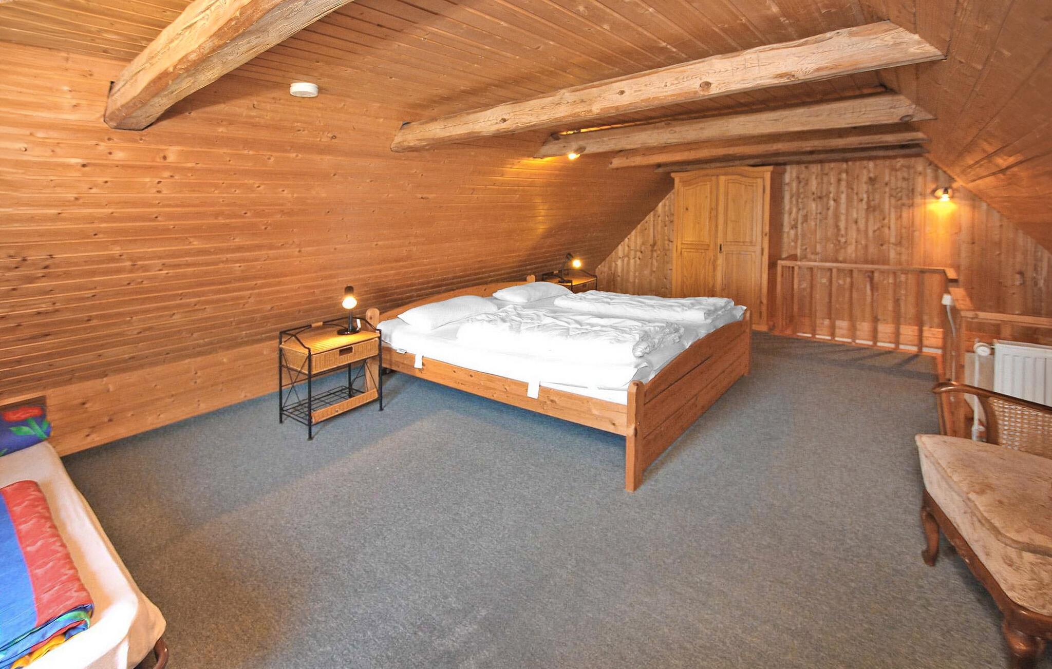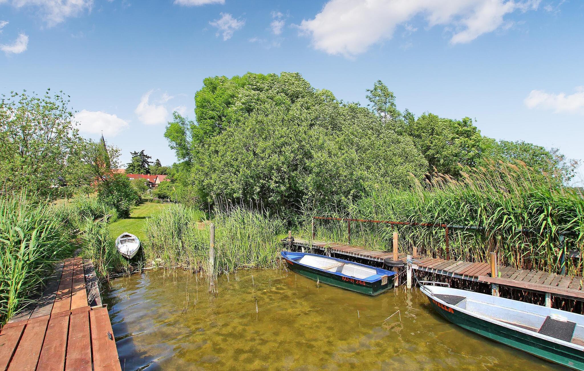 Den tidligere lade, bygget i rustik stil, står sammen med en beboelsesejendom, hvori der er yderligere to, separat lejede ferielejligheder, på ejerens store og indhegnede bolig-/vandfrontsejendom, direkte ved Jabel-søen. Sommerhuset er fritliggende og adskilt på ejendommen. Udsigt over søen fra terrassen. Indrettet med stue (polstrede møbler med sovefunktion, satellit-tv, radio), hems via pladsbesparende trappe (dobbeltseng, loftshøjde 1,90 m), åbent køkken (el-komfur, mikroovn, køleskab), bad/WC, central. opvarmning. Der er terrasse, grill, forskellige siddepladser på ejendommen, båd og badebro med robåde og padlebåde, frugthave, parkeringsplads og WiFi. Den samlede pris inkluderer vand- og energiforbrug samt slutrengøring. Medbring venligst sengelinned og håndklæder Kæledyr er ikke tilladt. BEMÆRK: Grundet den stejle trappe til hemsen er feriehuset ikke egnet til børn under 5 år! Idyllisk beliggende direkte ved Jabelsøen og i udkanten af naturparken Nossentiner/Schwinzer Heide, er den lille by Jabel det ideelle udgangspunkt for omfattende udforskninger i naturen, hvad enten det er til fods eller på cykel (langdistancecyklen Berlin-København stien løber direkte igennem) eller på vandet. Jabelsche See byder ikke kun på uafbrudt svømning, men også en moderne lystbådehavn og er forbundet med de nærliggende store søer, såsom Kölpin eller Fleesensee. En særlig attraktion er Damerower Werder-halvøen, et særligt beskyttet område, hvor bisoner har levet i en udendørs indhegning siden 1957 og kan observeres ved deres daglige fodring kl. 11.00. Der er også fiskefarm og stop for passagerbåde på Werder.Der er en restaurant i byen og en meget populær iskiosk lige ved søen. Butikker og andre restauranter samt anbefalede seværdigheder såsom Müritzeum Adventure Center findes i Waren (Müritz), cirka 10 km væk.
