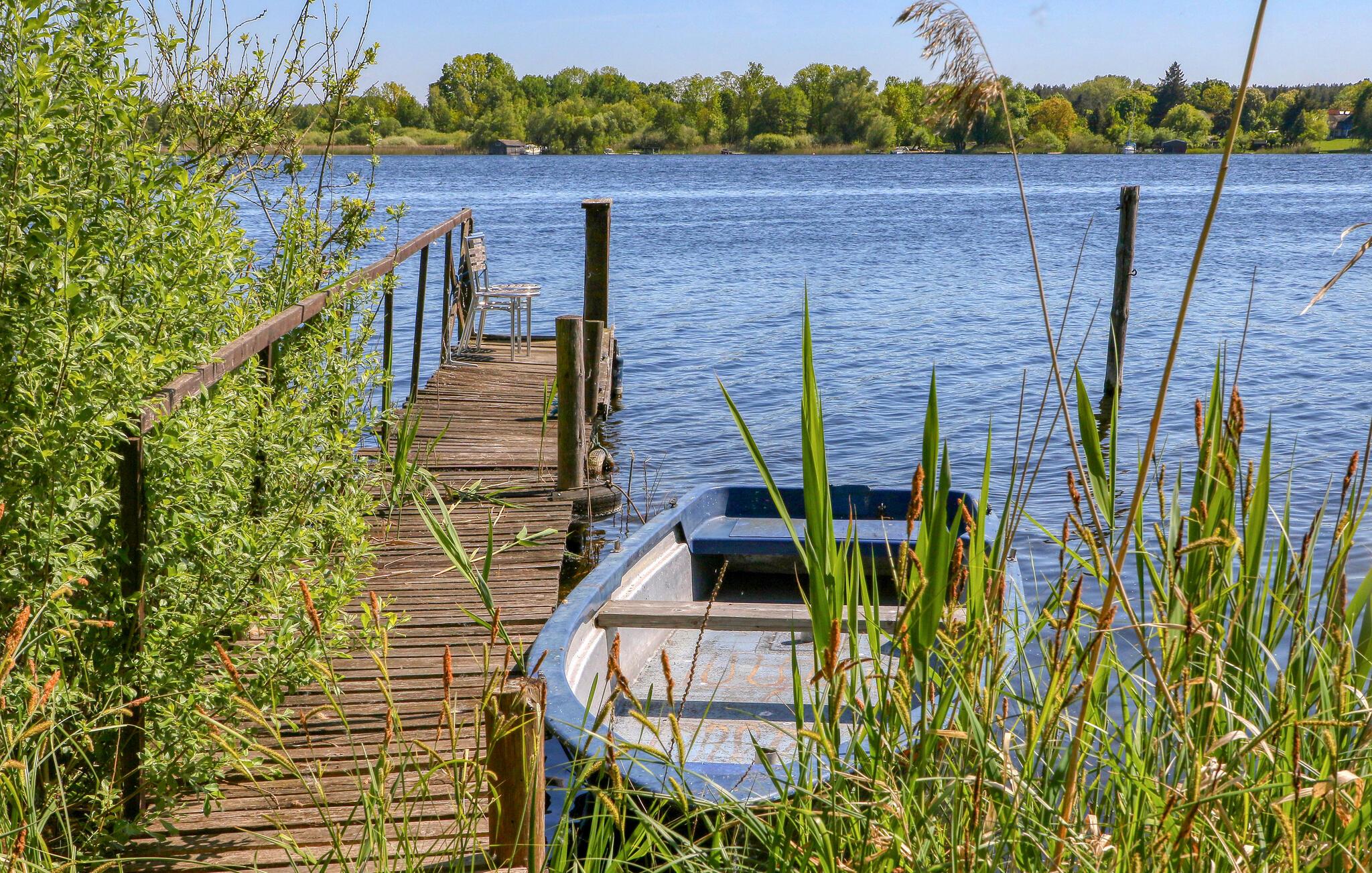 Ferielejligheden, som er nyudbygget i 2012, ligger i stueetagen i en beboelsesejendom på ejerens cirka 2000 kvadratmeter indhegnede bolig-/vandejendom, direkte ved Jabelschen-søen. Rigtig gode fiskeforhold. Faciliteter med: Stue (polstrede møbler, spiseplads, LCD TV, radio, kakkelovn), 2 soveværelser (1 x dobbeltseng, 1 x enkeltseng), køkken (el-komfur med ovn, køleskab med fryser, opvaskemaskine, mikroovn , spisebord, diverse.Køkken hvidevarer, kakkelovn), vinterhave med siddepladser/polstrede møbler, bad/WC, insektnet, centralvarme. Der er forskellige siddepladser, grillpladser ved søen, båd- og badebroer med robåde og padlebåde, grill, parkeringsplads og WiFi til rådighed. Den samlede pris inkluderer slutrengøring, vand og el. Medbring venligst eget sengelinned og håndklæder. Kæledyr er ikke tilladt i denne ejendom. Idyllisk beliggende direkte ved Jabelsøen og i udkanten af naturparken Nossentiner/Schwinzer Heide, er den lille by Jabel det ideelle udgangspunkt for omfattende udforskninger i naturen, hvad enten det er til fods eller på cykel (langdistancecyklen Berlin-København stien løber direkte igennem) eller på vandet. Jabelschen See byder ikke kun på uafbrudt svømning, men også en moderne lystbådehavn og er forbundet med de nærliggende store søer, såsom Kölpin eller Fleesensee. En særlig attraktion er Damerower Werder-halvøen, et særligt beskyttet område, hvor bisoner har levet i en udendørs indhegning siden 1957 og kan observeres ved deres daglige fodring kl. 11.00. Der er også en fiskegård og et stop for passagerbåde på Werder. Der er en restaurant i byen og en meget populær isbar lige ved søen. Butikker og andre restauranter samt anbefalede seværdigheder såsom Müritzeum Adventure Center findes i Waren (Müritz), cirka 10 km væk.