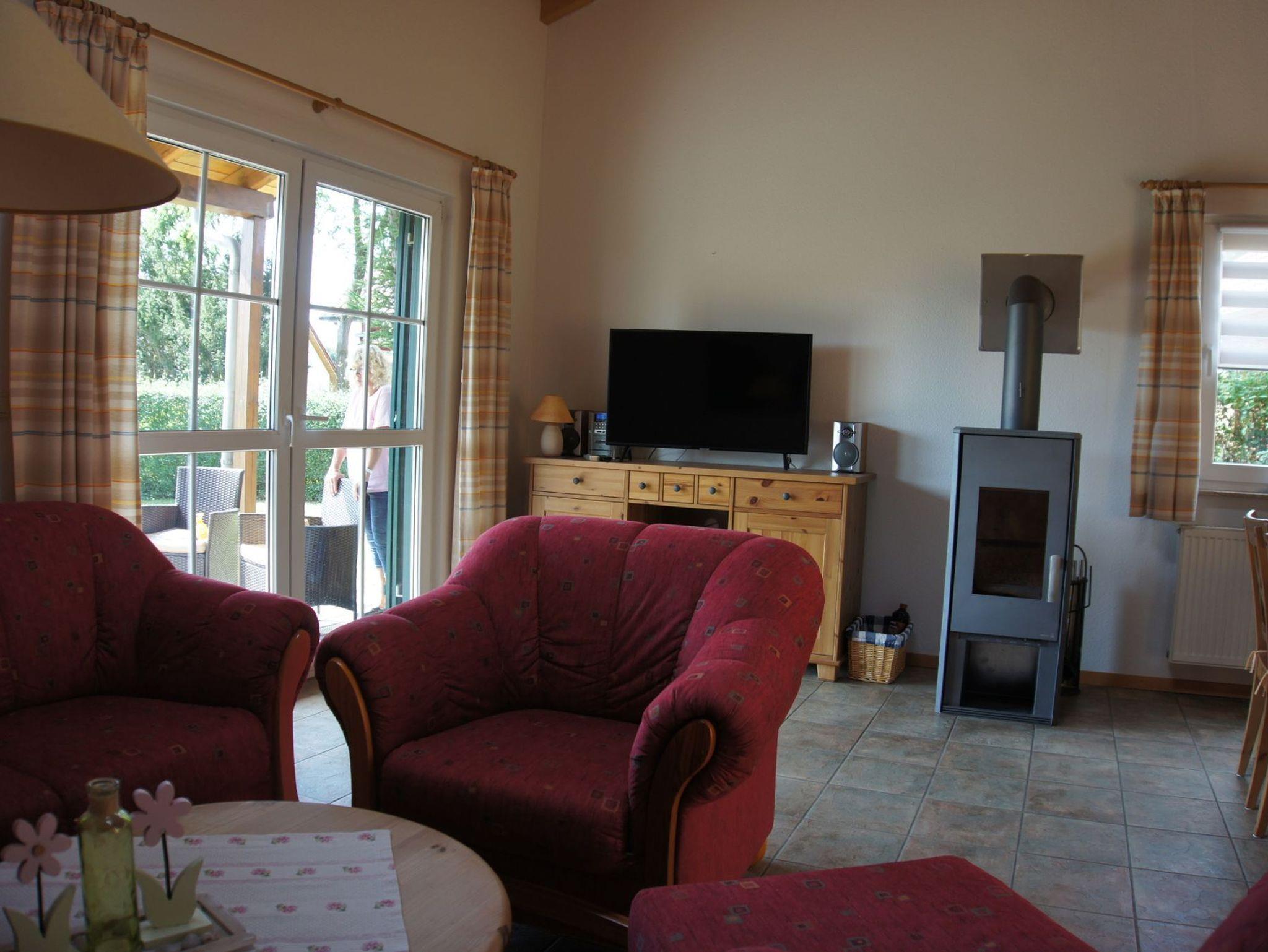 Das gemütlich eingerichtete Haus verfügt über einen großzügigen Wohnraum mit Kamin und direktem Zugang zum Garten.