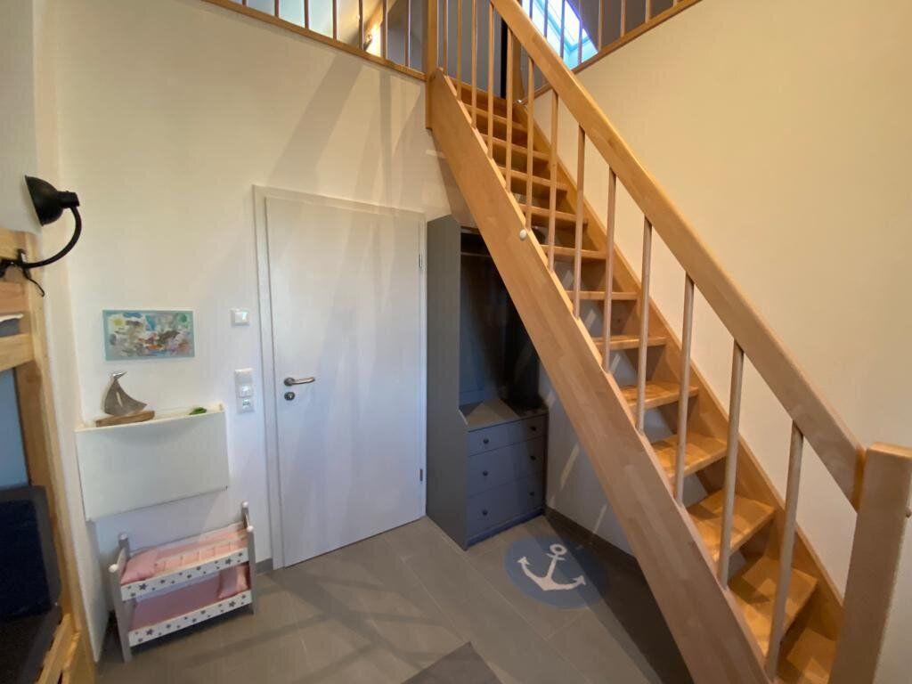 Das Haus ist barrierefreundlich, verfügt über viel Platz und eine Sonnenterrasse. Das großzügige Wohn- und Esszimmer verfügt über eine gemütliche Couch, einen Gas-Kamin und eine top moderne Küche mit 6 Plätzen. Die Kücheninsel hat im Induktionsfeld eine integrierte Dunstabzugshaube Es gibt ein Hauptschlafzimmer mit Boxspringbett und ein kleineres Schlafzimmer mit Etagenbett, welches auch als Spieltisch nutzbar ist und einer Spielebene mit weiteren zwei Betten. Hier oben kann man gemütlich entspannen. Treppenschutzgitter oben und unten vorhanden. Hochwertige Plissee/ Verdunkelung und Fußbodenheizung sind ebenfalls vorhanden.