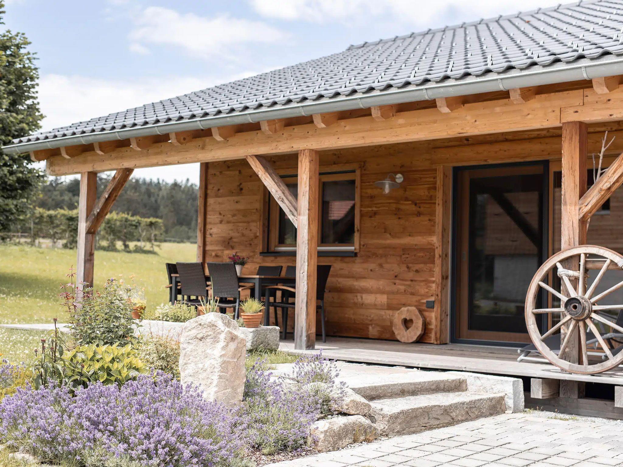 Sehr gemütliches Holzhaus im Westernstil mit Blick zum historischen Wollaberg sowie zur Pferdekoppel und der Sommerweide der Rinder – pure Liebe zum Detail, eigener Eingang, ebenerdig, sodass man gleich im Freien ist. Die überdachte große Veranda wird gerne genutzt um draußen zusammen zu essen und zu spielen. Davor kann gegrillt werden.