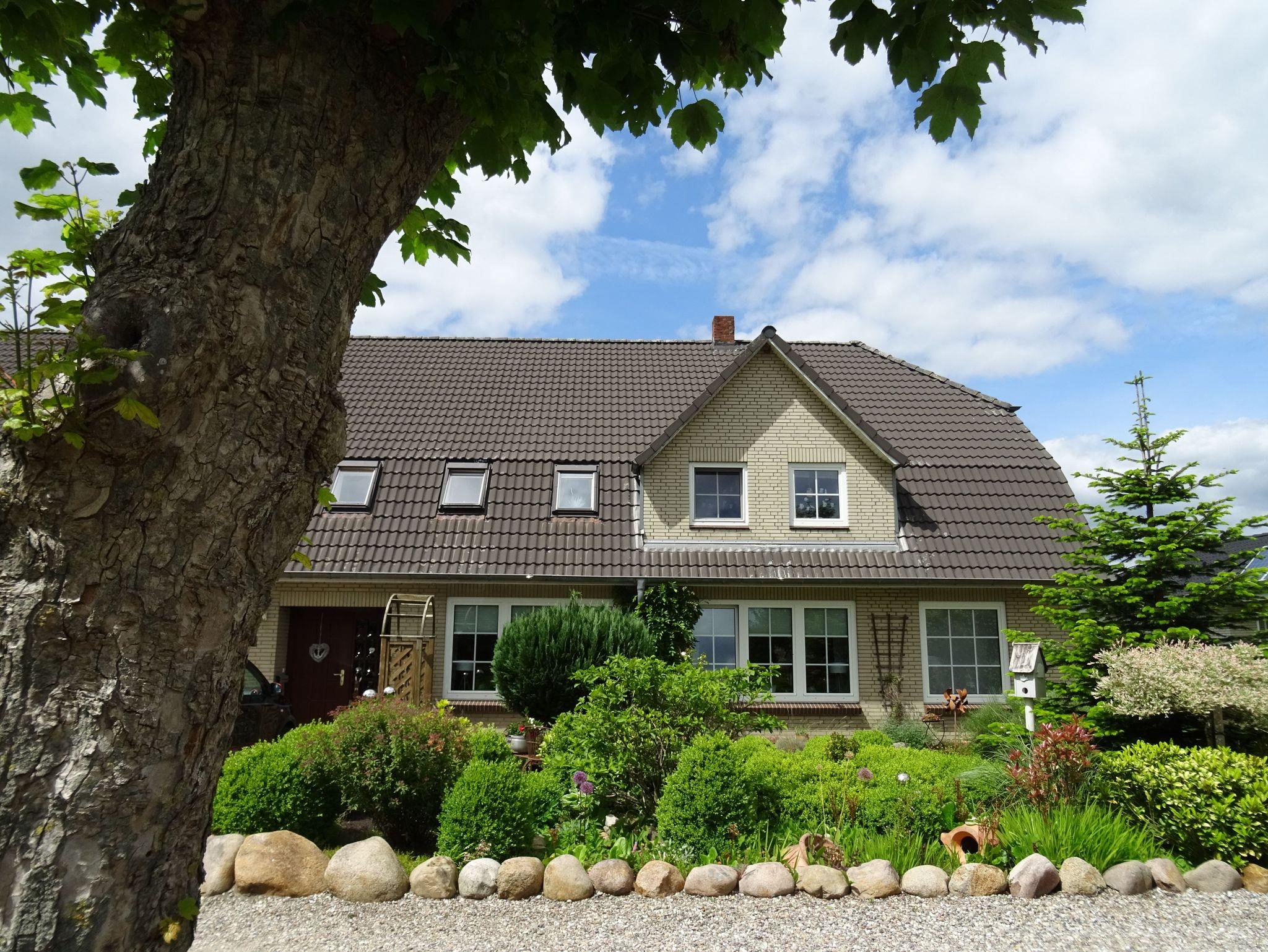 Die Ferienwohnung verfügt über ein großes Wohn- und Esszimmer mit Holzdielenboden und antikem Kachelofen, einer Einbauküche mit Esstisch und Zugang zur Terrasse mit Garten und Spielgeräten sowie einem Badezimmer mit ebenerdiger Dusche und Badewanne. Es gibt drei Schlafräume: ein Schlafzimmer mit Doppelbett, davon abgehend ein Schlafraum mit französischem Bett und ein weiterer separater Schlafraum mit einem französischen Bett (1,40 x 2,00m).