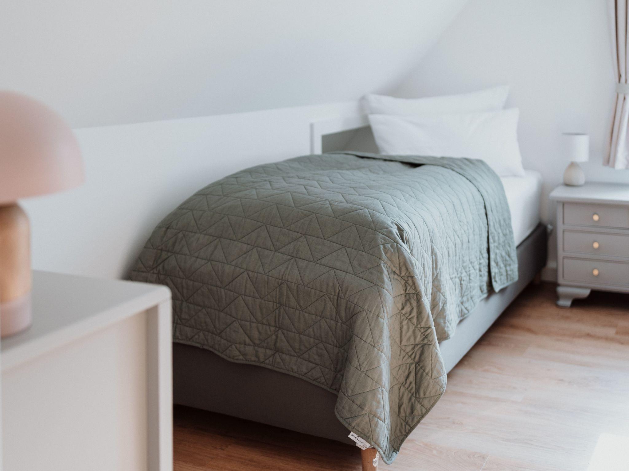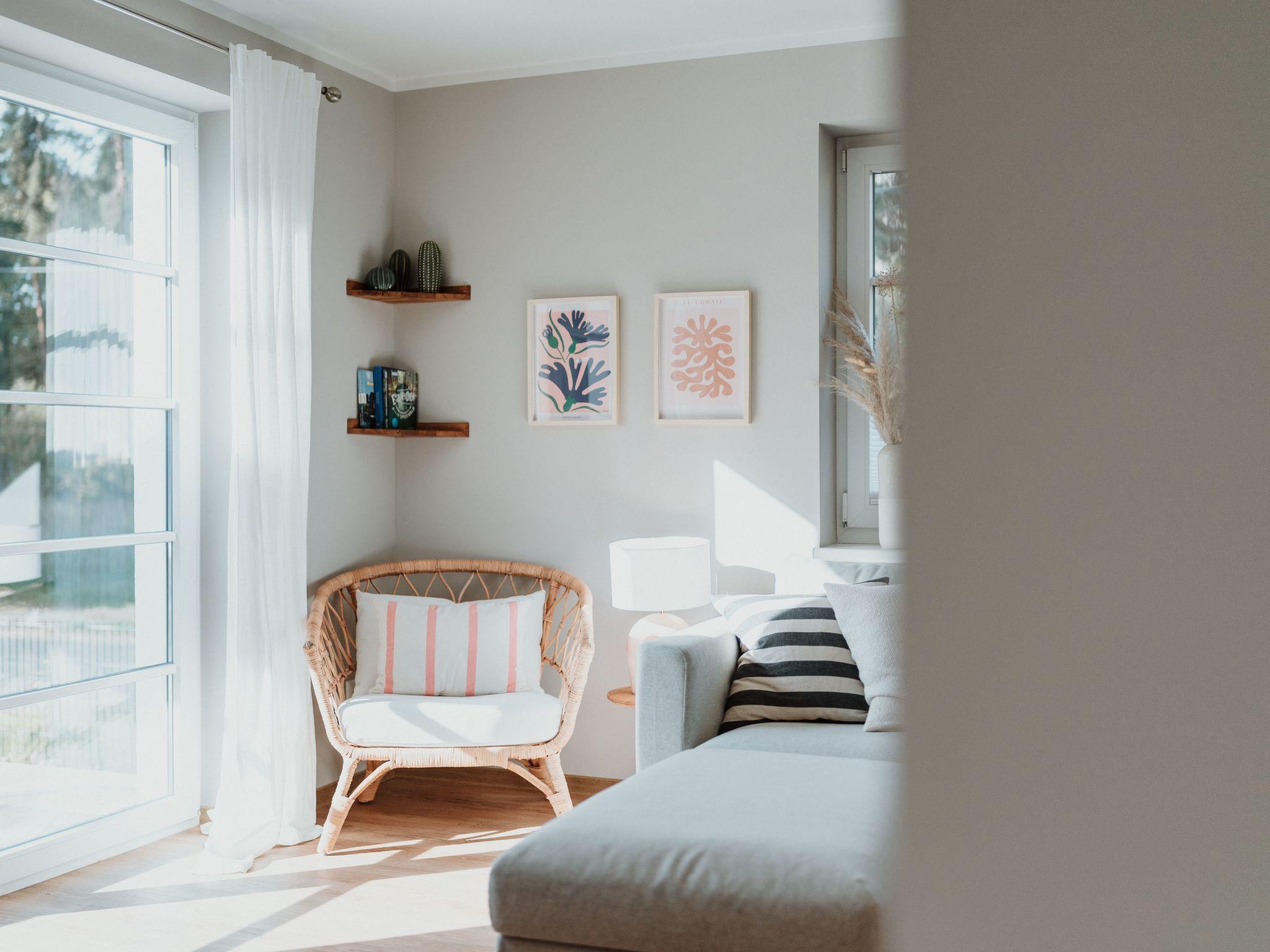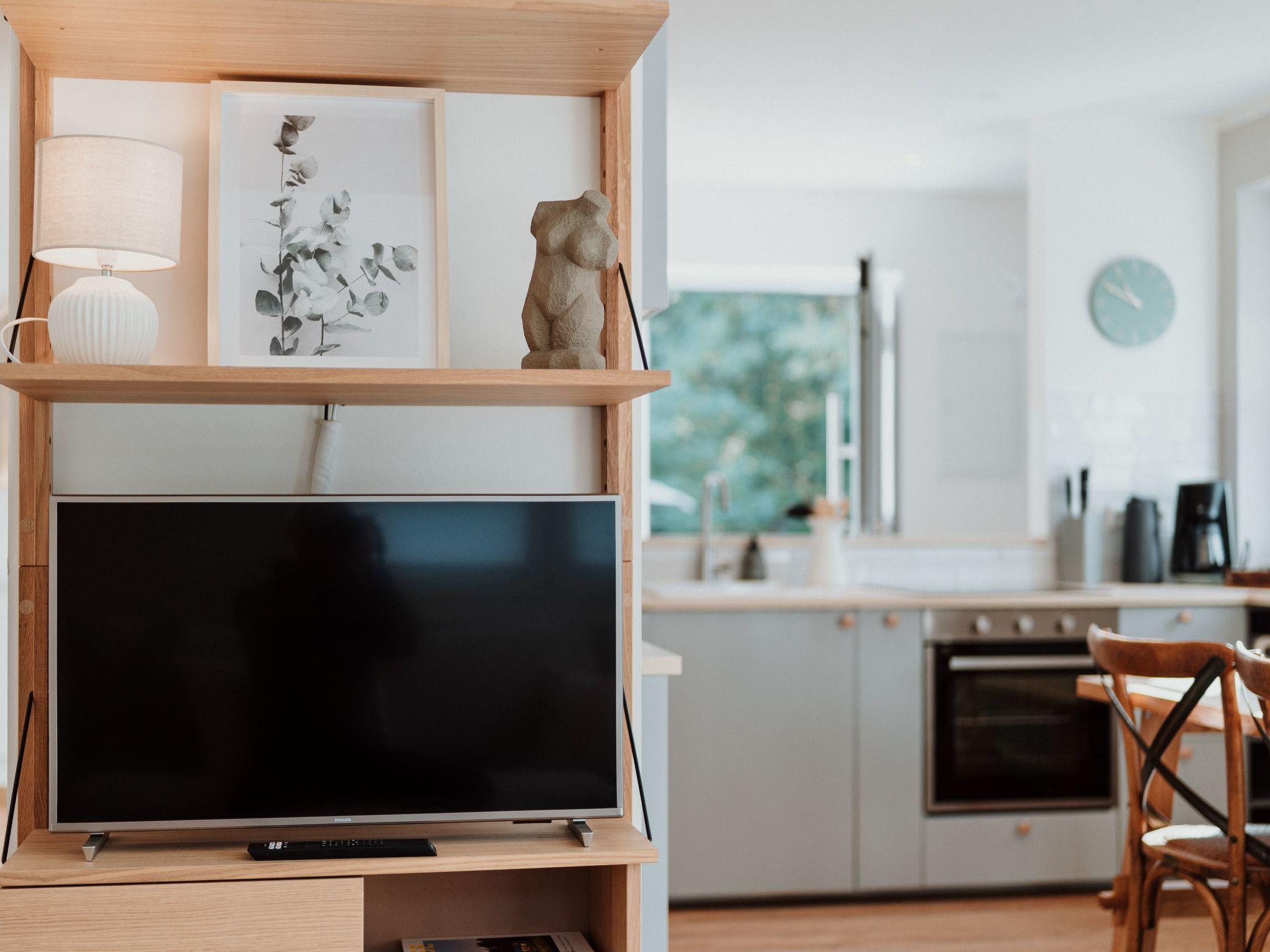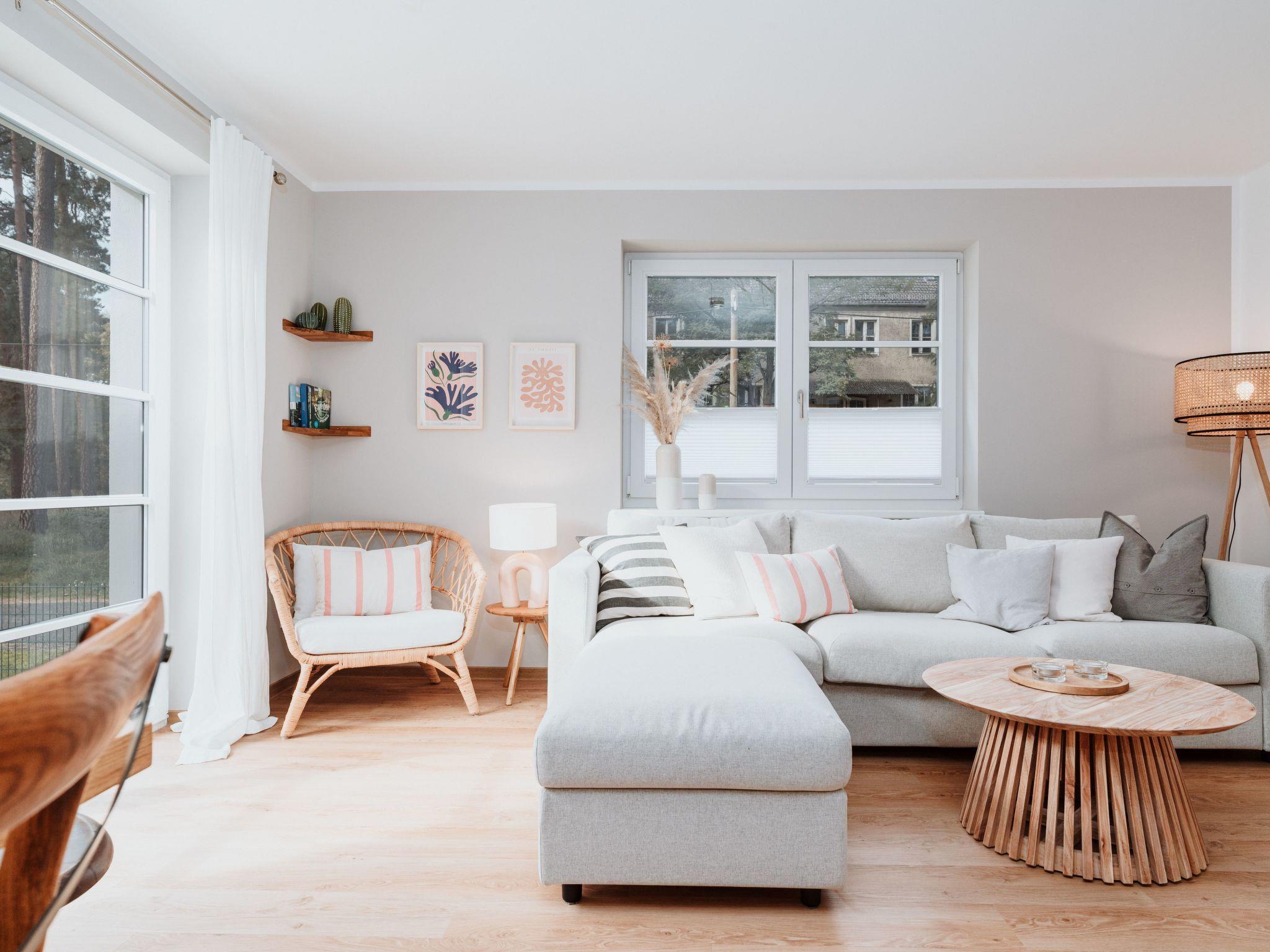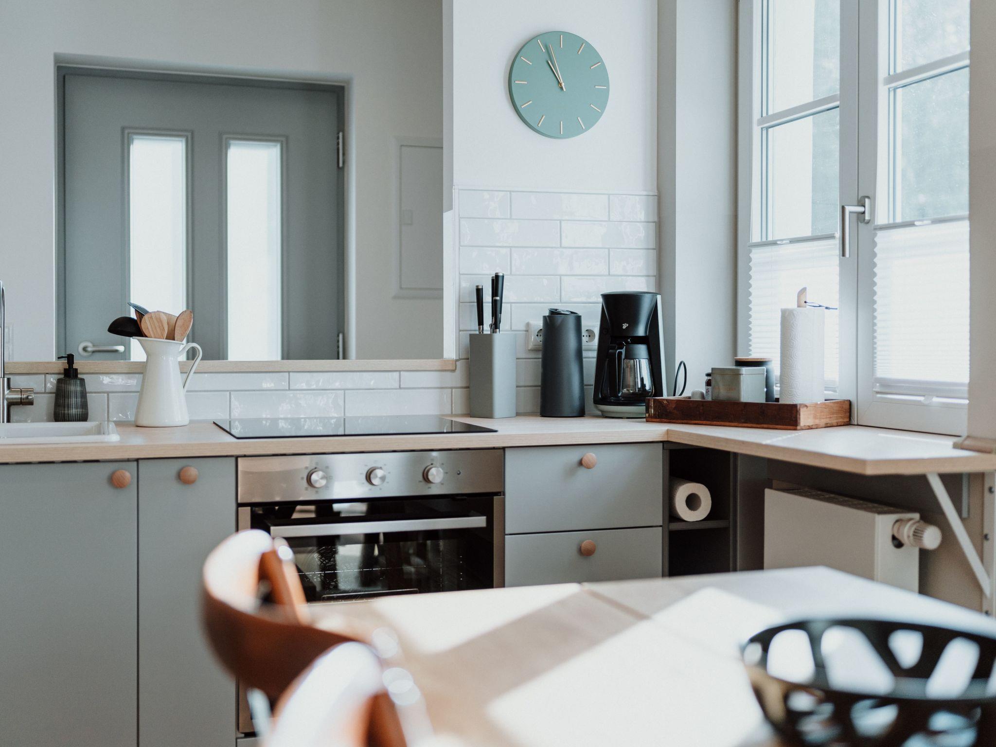 The main house has 2 bedrooms with comfortable box-spring beds for 4 people (1 x 180 cm, 2 x 90 cm), and the sofa bed in the living room can also be pulled out (please note: the room cannot be darkened!) The two bathrooms each have a large walk-in rain shower and underfloor heating, and the open-plan kitchen/living room can be used for cooking on a 4-burner induction hob. Dishwasher, fridge with small freezer compartment are also available.