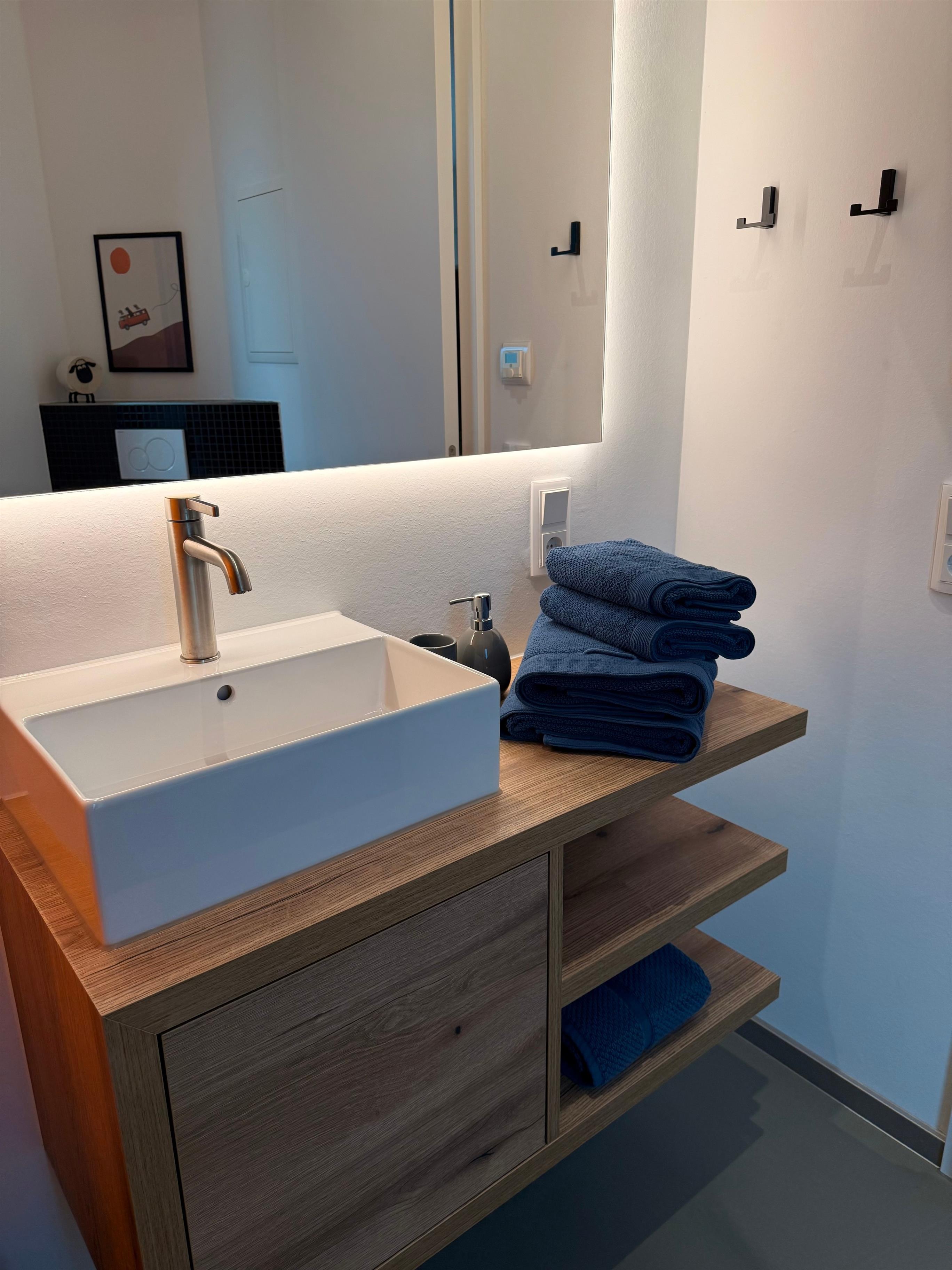 In diesem Ferienzimmer erwartet Sie ein luxuriöses Badezimmer, das mit einer atemberaubenden Regenwalddusche ausgestattet ist. Das sanfte Rauschen des Wassers bringt Ihnen nicht nur Entspannung, sondern erzeugt auch positive Energie, die Ihren Geist und Körper revitalisiert. Besonders die orange hinterleuchtete Dusche sorgt für eine angenehme Atmosphäre und ein Gefühl der Wärme, das Ihren Aufenthalt zu einem unvergesslichen Erlebnis macht. Lassen Sie die Sorgen des Alltags hinter sich und genießen Sie das erfrischende Erlebnis in Ihrem eigenen kleinen Paradies.