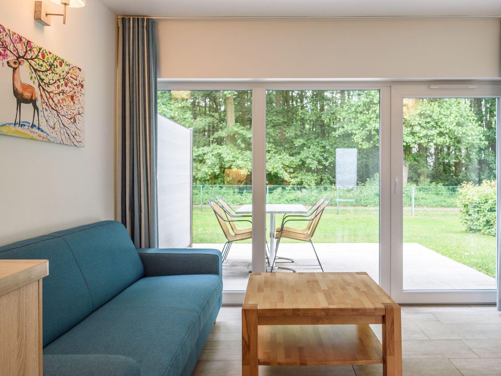 Der Wohnbereich ist der Zentrale Bereich dieses gut gelegenen Ferienhauses am See. Von dort aus erreichst du die Terrasse mit eigener Wiese, die zum verweilen einlädt. Der Wohnbereich ist ausgestattet mit einer Couch, einem LCD-TV sowie einem Esstisch.