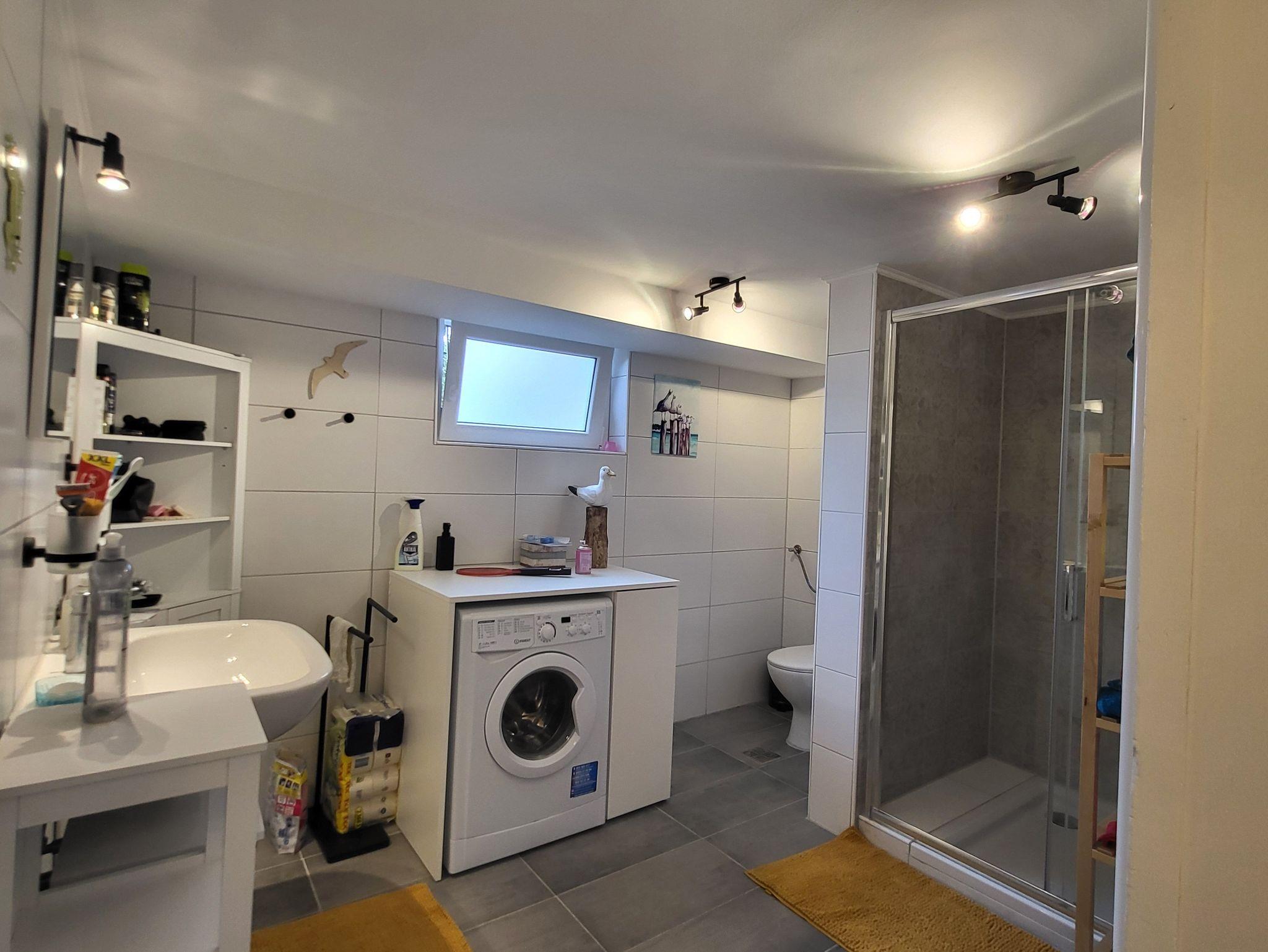 Das neue Badezimmer bietet eine große Dusche sowie ausreichend Platz für deine persönlichen Dinge. Das Fenster kann zum Lüften leider nur gekippt werden, aber damit kommt ihr klar. Außerdem befindet sich im Badezimmer eine Waschmaschine und Trockenmöglichkeiten am großen Handtuchheizkörper.