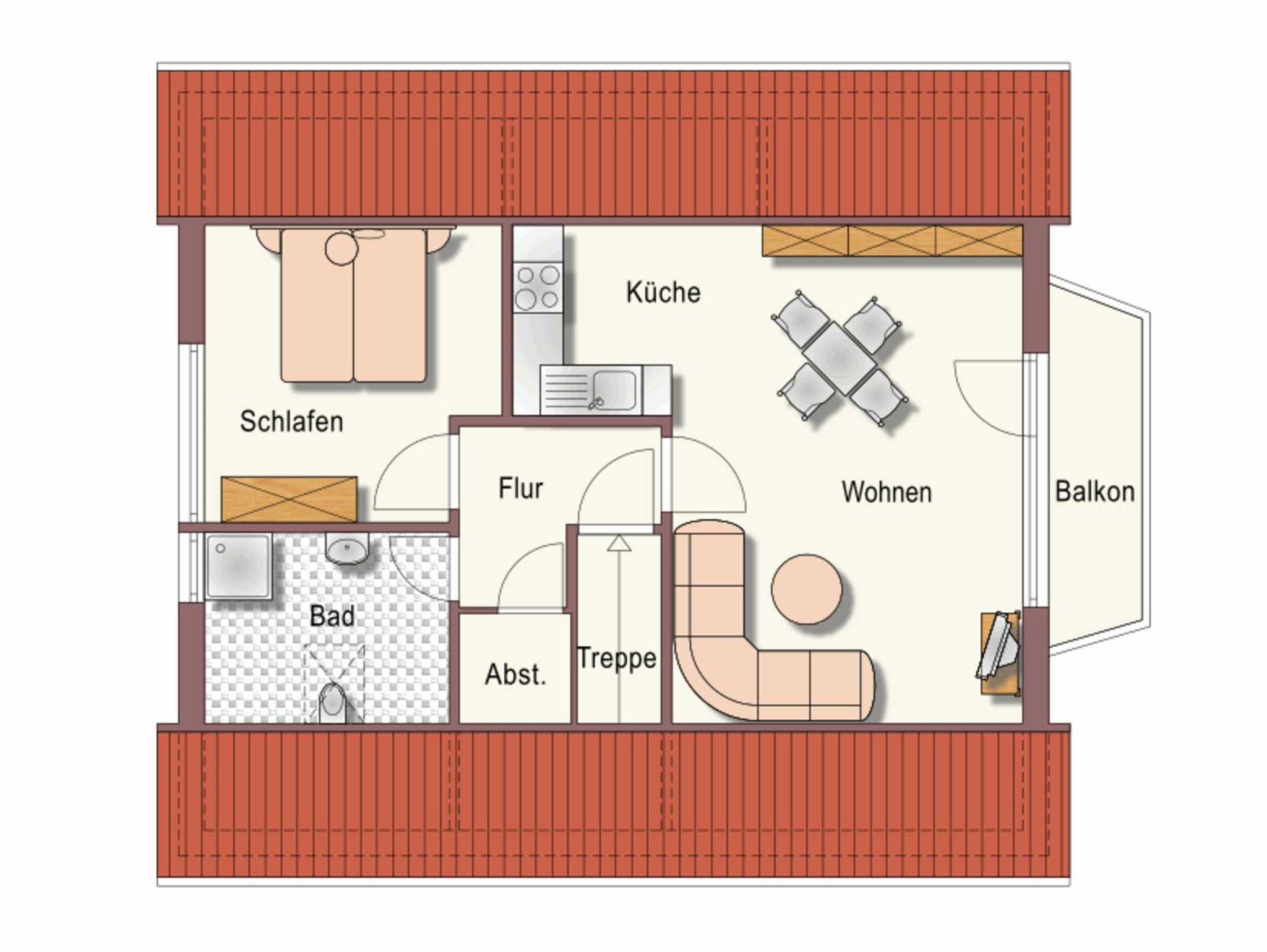 Fußbodenheizung, Essecke, TV, Internetanschluss und Balkon,