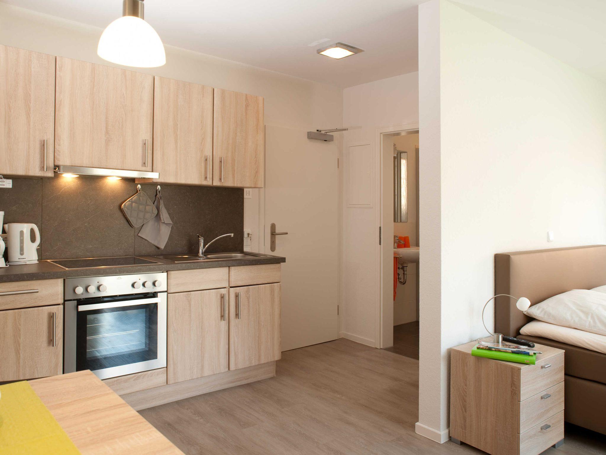 Modern ausgestattetes Ein-Raum-Appartement mit Doppelbett und Küchenzeile, Badezimmer mit Dusche sowie Terrasse.