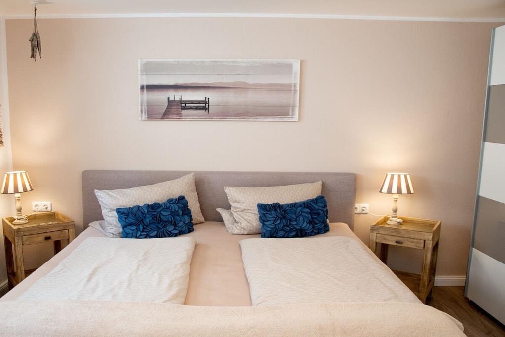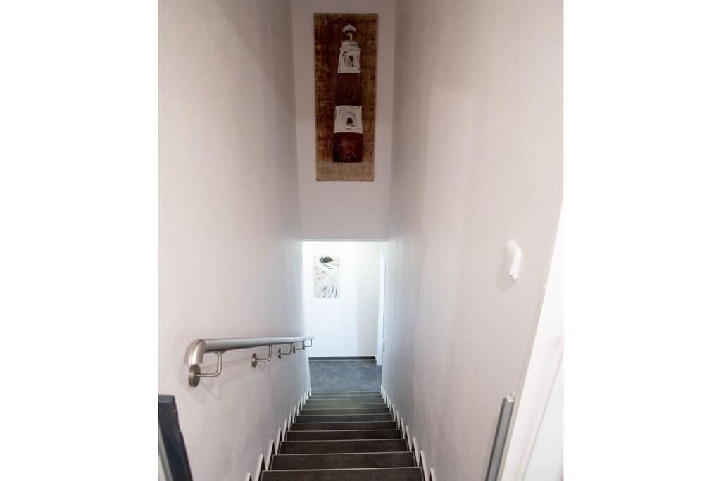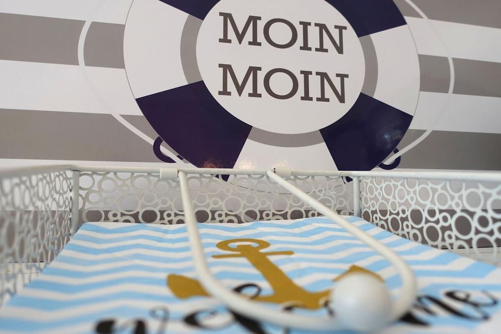 Die liebevoll maritim, modern eingerichtete Wohnung Bullauge erstreckt sich über zwei Etagen und ist etwa 65m² groß. Der Flur, der separate Garderobenraum, die Küche und der große, lichtdurchflutete Wohn-Essbereich befinden sich im Erdgeschoss. Das geräumige Schlafzimmer mit zwei Fenstern, sowie das Duschbad liegen im Souterrain. Neben dem Doppelboxspringbett und einem modernen Wandklappbett im Schlafraum bietet ein komfortables Schlafsofa im Wohnraum zwei weitere Schlafgelegenheiten. Bei einer 3- Personen Belegung ist der Schlafraum ideal. Gerne stellen wir ein Babybett, Treppentörchen und einen Triptrap zur Verfügung. Sat- TV, DVD- Player und freies W- LAN sind vorhanden.