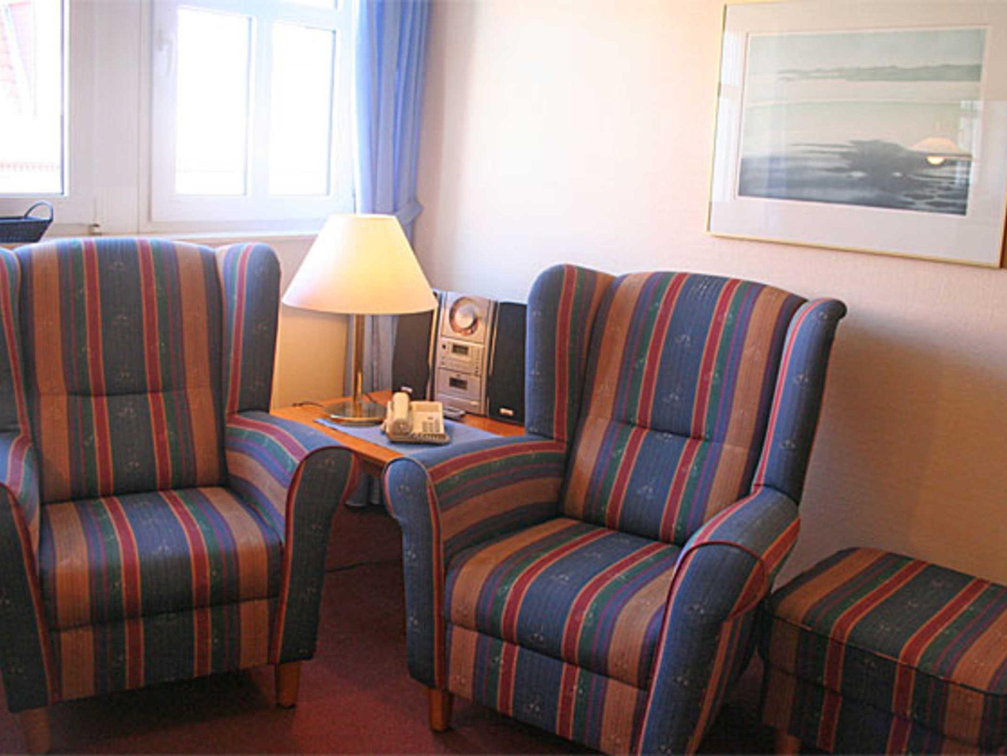 Gemütliche 1-Zimmer-Ferienwohnung auf Juist mit Schlafbereich, Sitzecke, Sesselgarnitur und Kochnische.