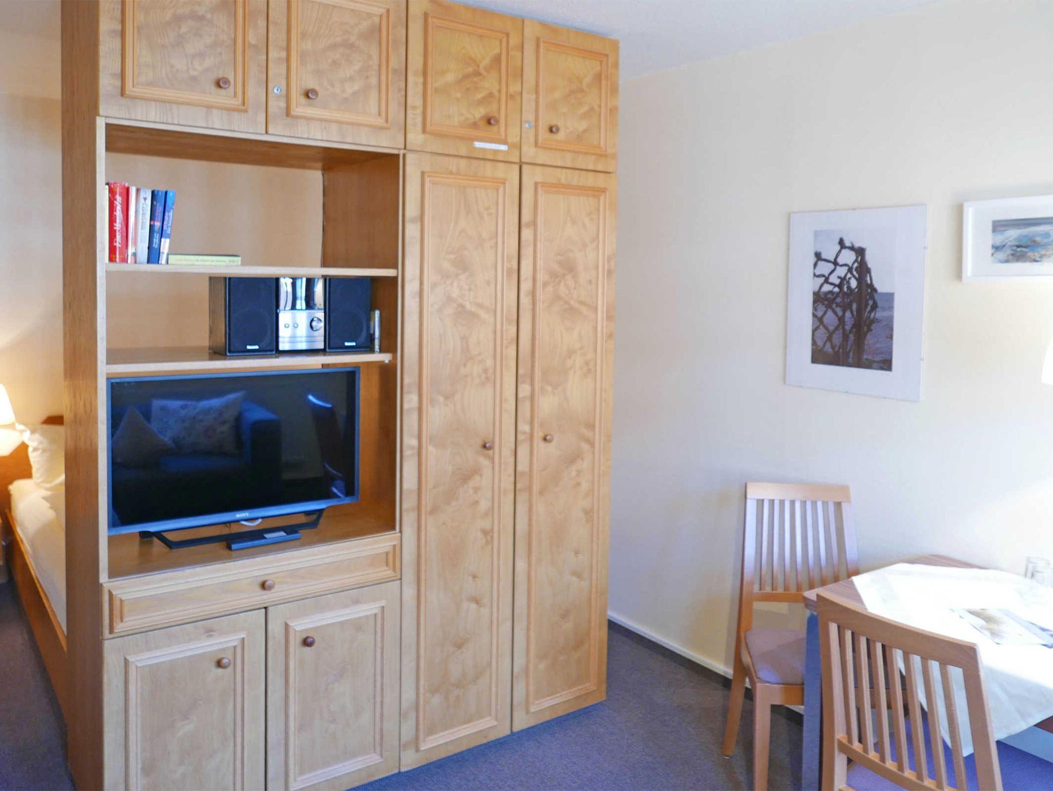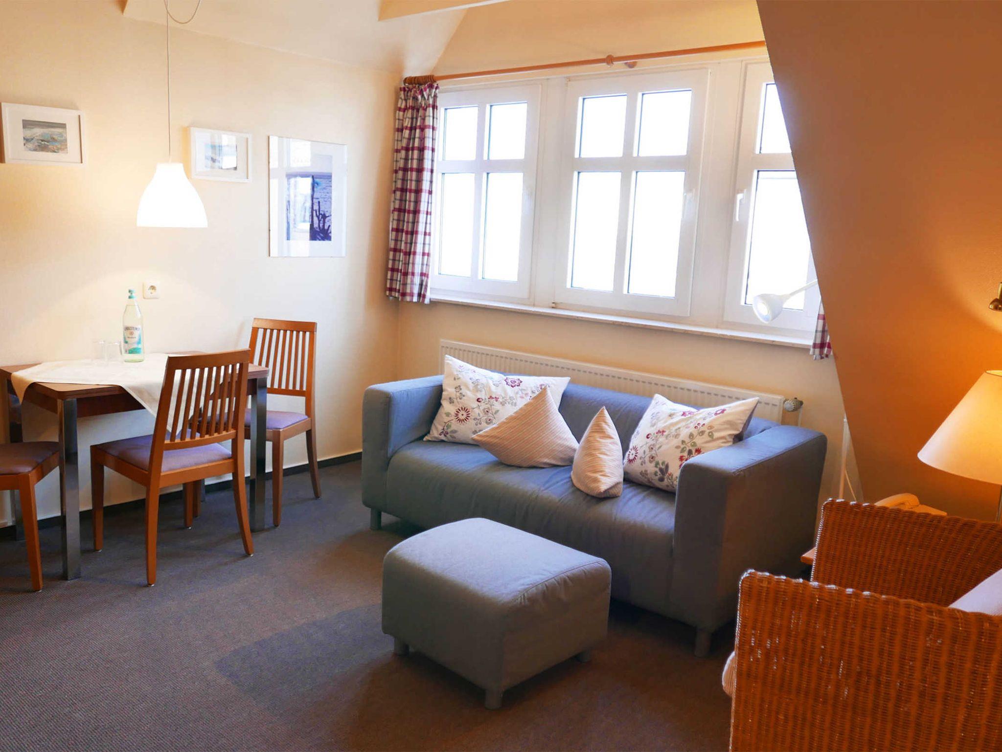 Die gemütliche 2-Zimmer-Wohnung für 2 Erwachsene und 1 Kind in der Inselresidenz Strandburg verfügt über ein Wohn-/Schlafzimmer mit optisch getrenntem Schlafbereich mit Doppelbett sowie einem Kinderzimmer mit Einzelbett.