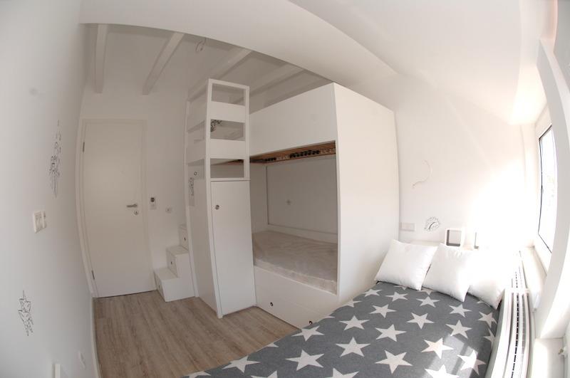 3-Zimmer Ferienwohnung mit Schlafzimmer (Doppelbett), Kinderzimmer (Etagenbett und Einzelbett), Wohnküche (Schlafsofa für 2 Personen) mit komplett eingerichteter Küche und Essplatz, Flatscreen LCD TV, kleine Loggia, Bad mit Fenster (Badewanne, Dusche, WC, Doppelwaschbecken), WLan