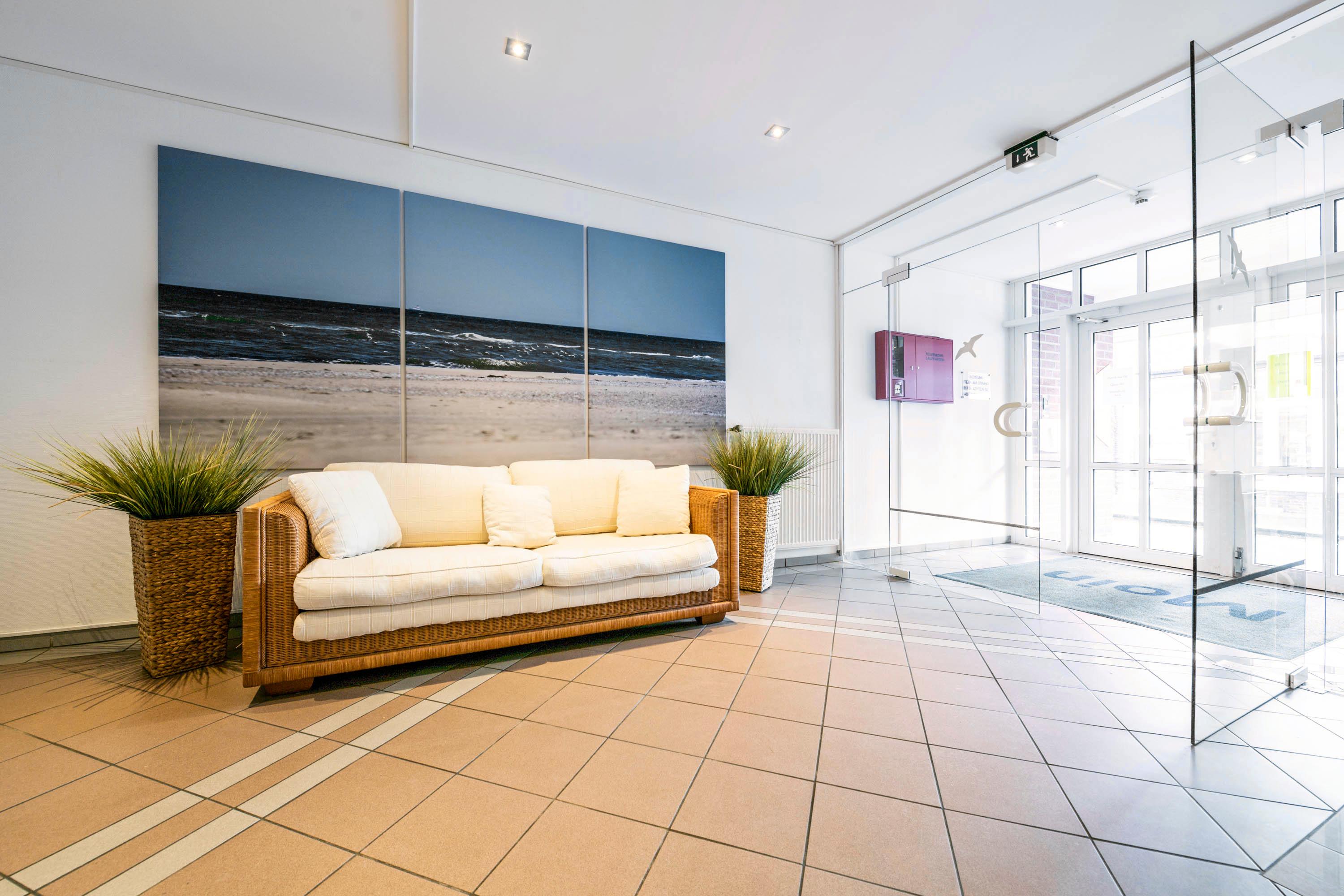 Diese komfortabel eingerichtete Ferienwohnung 307 in der ferienwohnung-juist-strandburg mit Schwimmbad und Sauna wurde 2025 komplett renoviert und eignet sich perfekt für 2 bis 3 Personen. Die Wohnung besteht aus 2 Zimmern. Im Wohnraum mit gemütlichem Sofa und Sessel steht optisch getrennt das freistehende Doppelbett (statt Schlafsofa). Genießen Sie Ihr Lieblingsprogramm auf dem schwenkbaren Smart TV, entweder vom Sofa oder vom Bett aus. Im 2. Zimmer befindet sich die 3. Schlafmöglichkeit, sodaß dieses Zimmer einen weiteren Rückzugsort bietet. Die Küchenzeile ist komplett ausgestattet mit Kühlschrank, Geschirrspüler, 2er Induktionskochfeld, Kaffeemaschine, Wasserkocher etc. Am runden Esstisch finden bis zu drei Personen Platz. Den Gästen der Inselresidenz Strandburg steht der hauseigene Wellnessbereich mit Schwimmbad und Sauna zur Verfügung. Im Mietpreis enthalten sind Bettwäsche, Handtücher, Geschirrtücher. Ein Hochstuhl + Kinderbett auf Anfrage. Bei Anreise liegen Bademäntel für 2 Erwachsene bereit, weitere Bademäntel für Mitreisende auf Anfrage (Kindergrößen vorhanden). Die Wohnung liegt in der 3. Etage und ist problemlos mit einem Aufzug zu erreichen. Bei Ankunft im Haus werden Sie von der freundlichen Hausdame am Empfang begrüßt, die Ihnen auch während Ihres Aufenthaltes bei Fragen gerne zur Verfügung steht. Im Untergeschoss stehen Ihnen Münzwaschmaschinen- und Trockner zur Verfügung. Es ist bis zu 1 Hund gegen Aufpreis in der Wohnung erlaubt. Hierfür gilt die Hunde Hausordnung der Inselresidenz Strandburg.