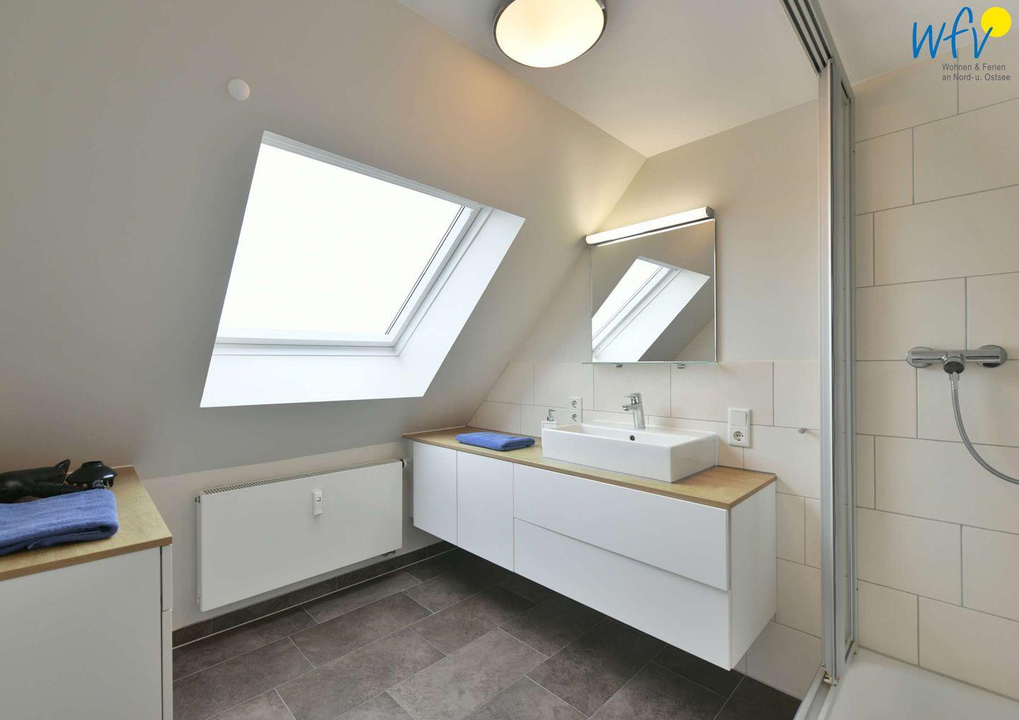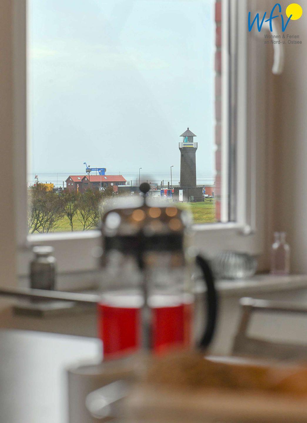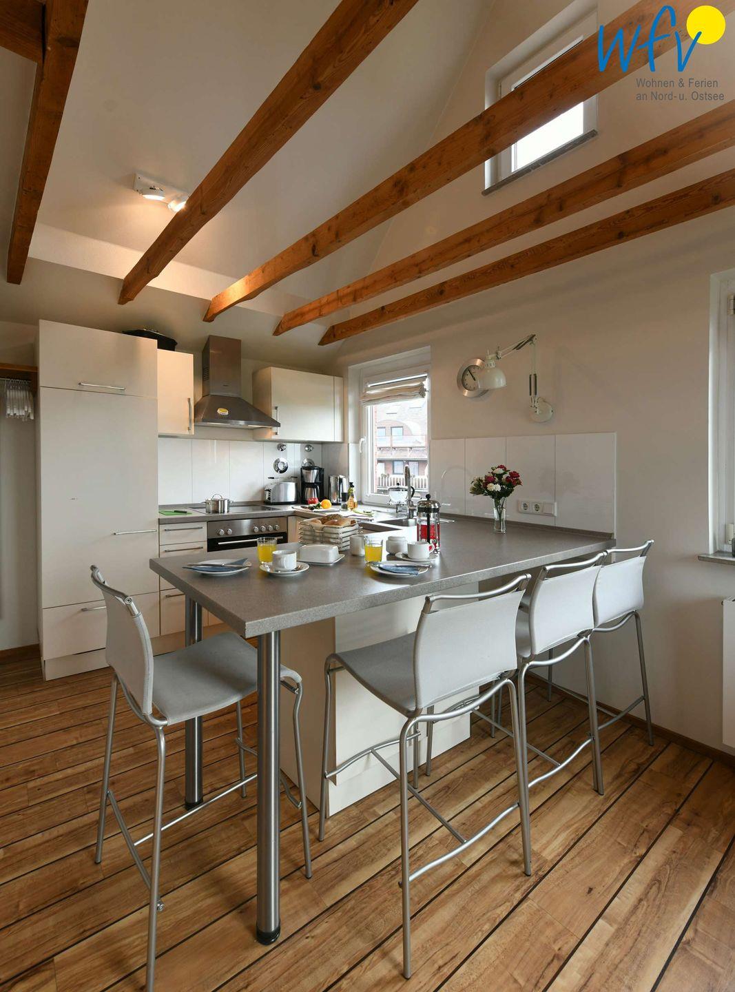Die offene Decke und große Fenster zum Wattenmeer verleihen der Ferienwohnung eine schöne Weite. In der Wohnküche kann am Tresen gemeinsam gekocht und gegessen werden. Vom Cabriofenster aus lädt der Blick über das Wattenmeer zum Träumen ein.