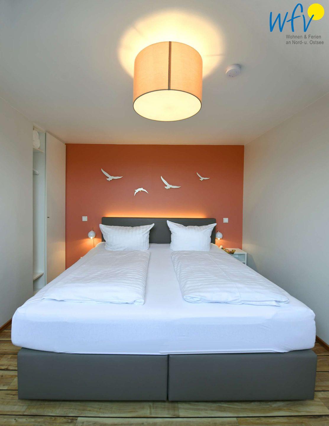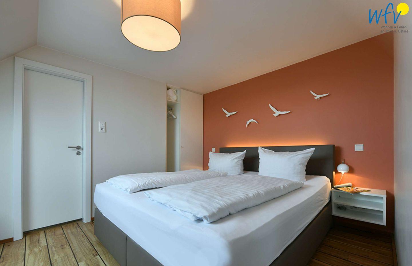 Das geräumige Schlafzimmer verfügt über ein großes Boxtopbett (180 x 200 cm) und viel Stauraum für Koffer und Kleidung. Auch ein Kinderreisebett hat hier bei Bedarf Platz. Über eine offene Galerie gelangt man zu einer Schlafempore, auf der sich zwei Kinder gemütlich einrichten können.