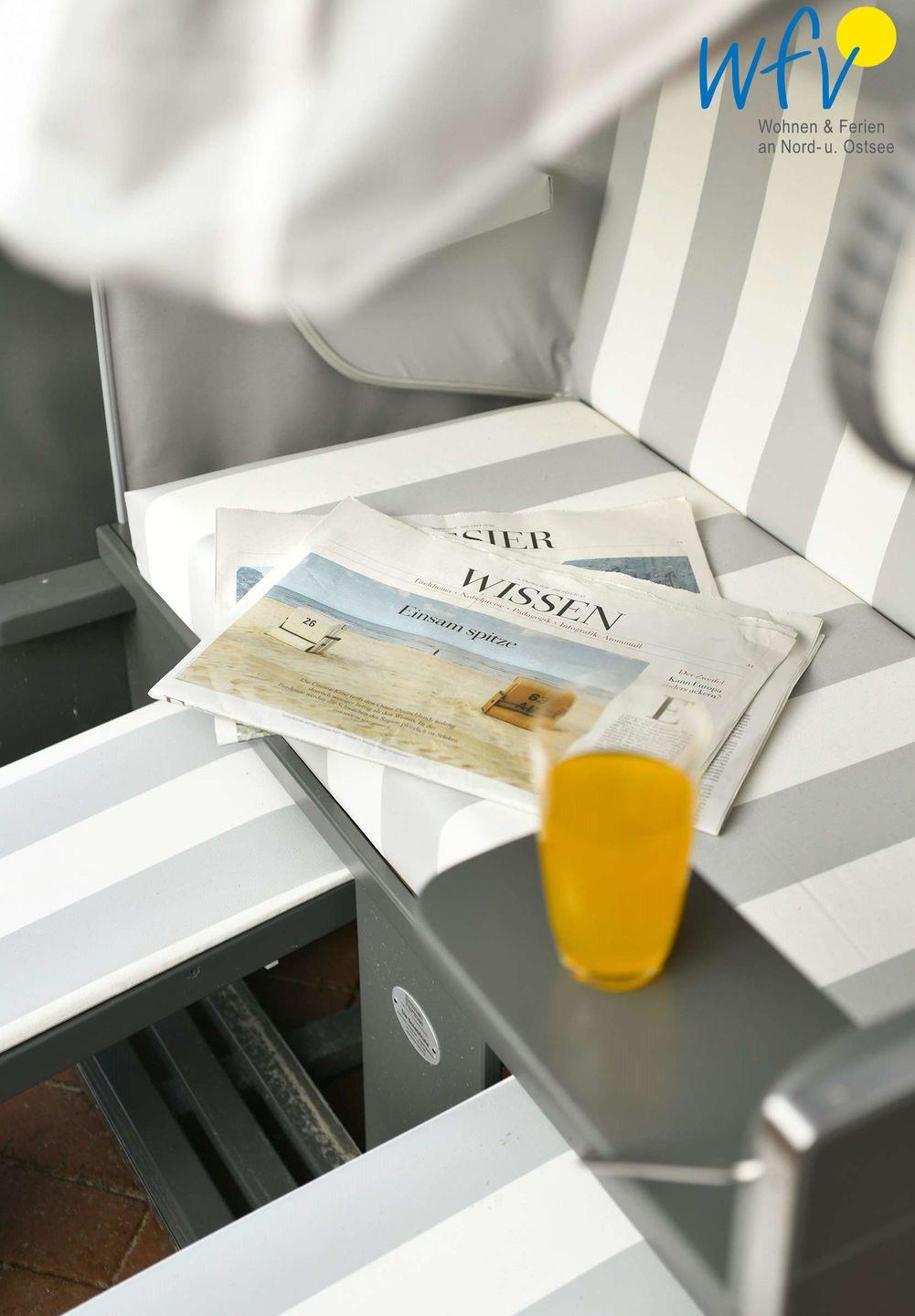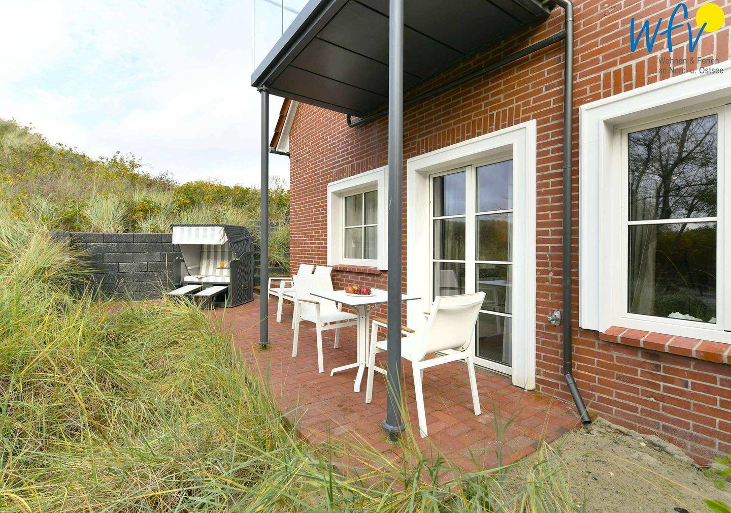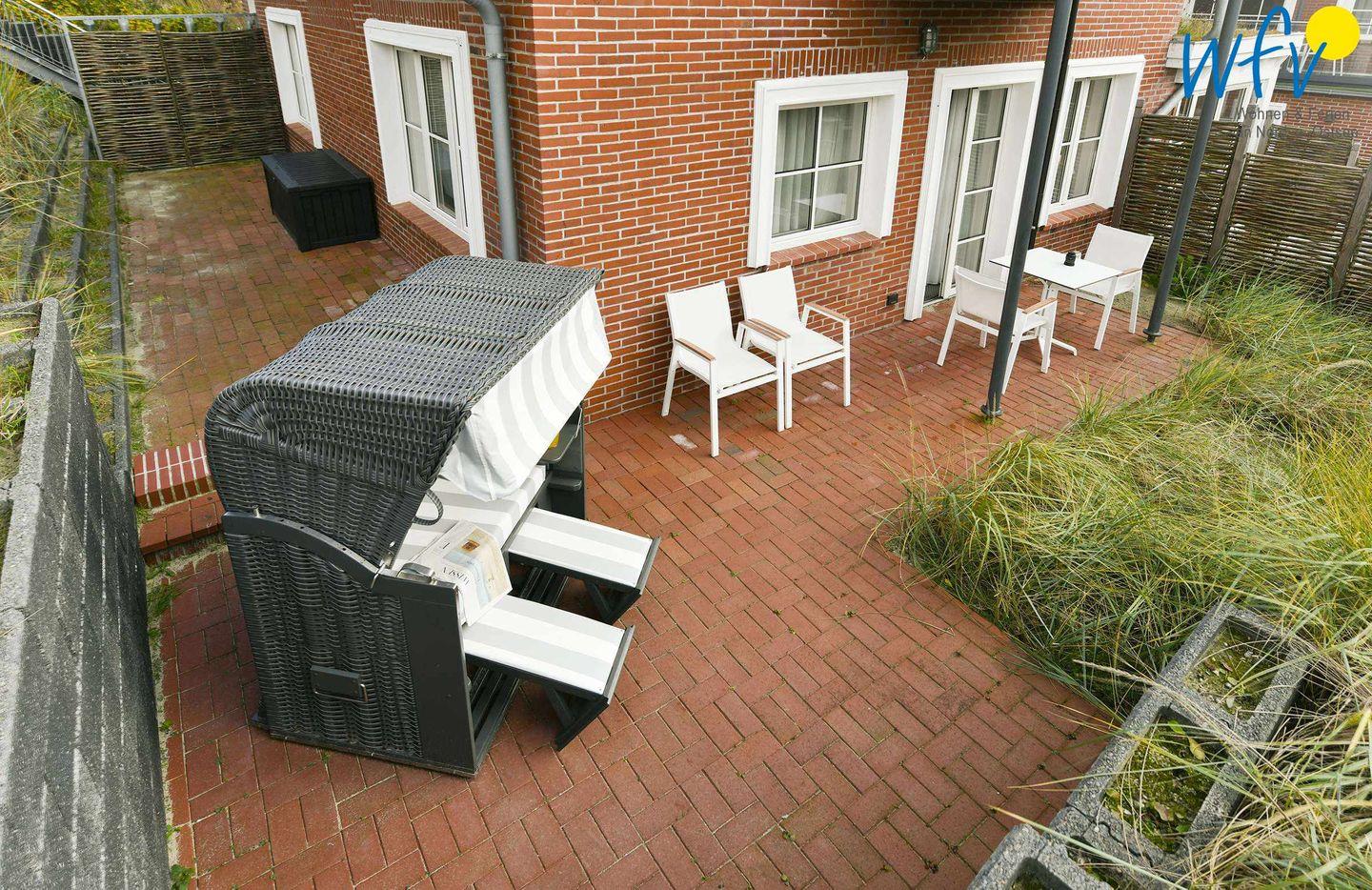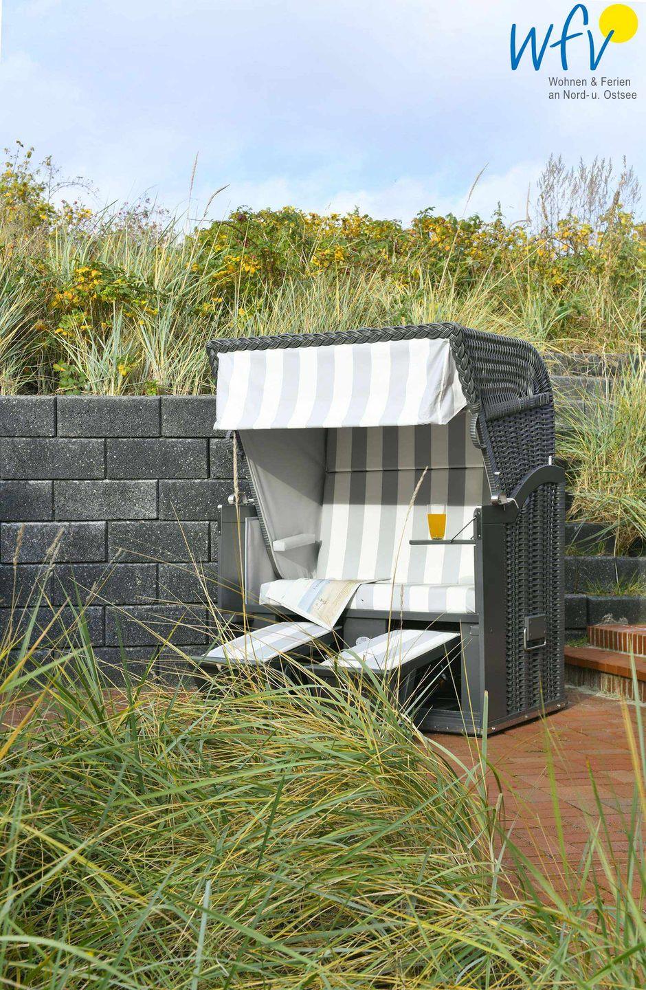 Auch die große Terrasse lädt zum Entspannen ein - besonders im windgeschützten Strandkorb mit Blick in den Garten und auf den Dünenkessel Juist! Hier können Sie bei frischer Nordseeluft nahezu den ganzen Tag die Sonne genießen, bis zu Ihrem Untergang über den Dünen...