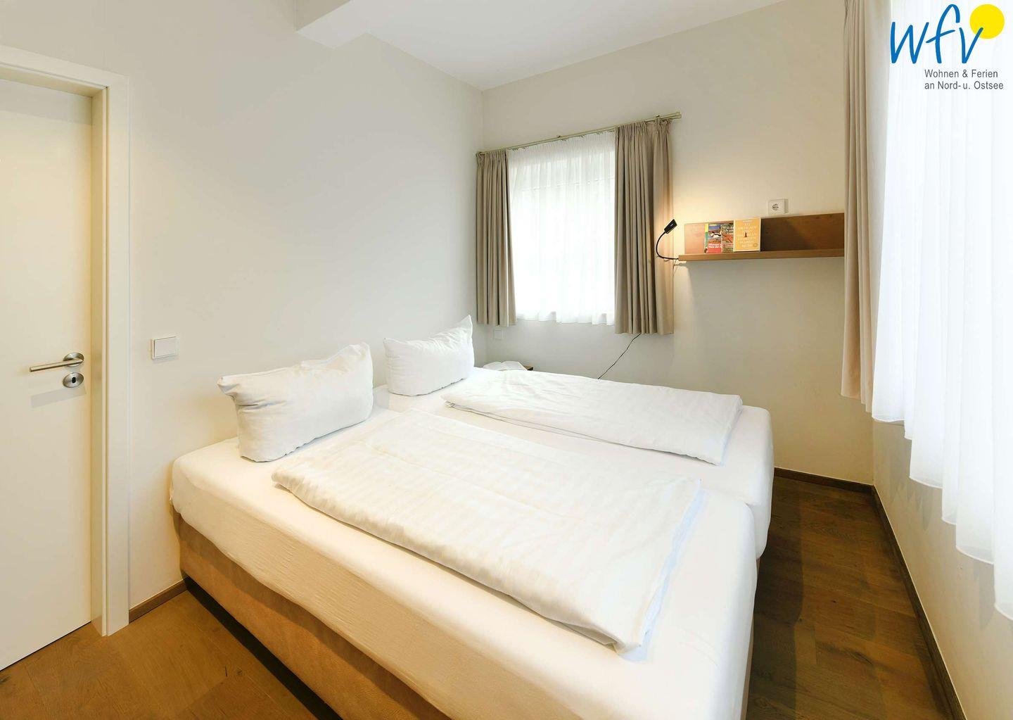 Die zwei separaten Schlafzimmer der Ferienwohnung "Dünenkoje" sind jeweils mit einem gemütlichen Doppelbett ausgestattet.