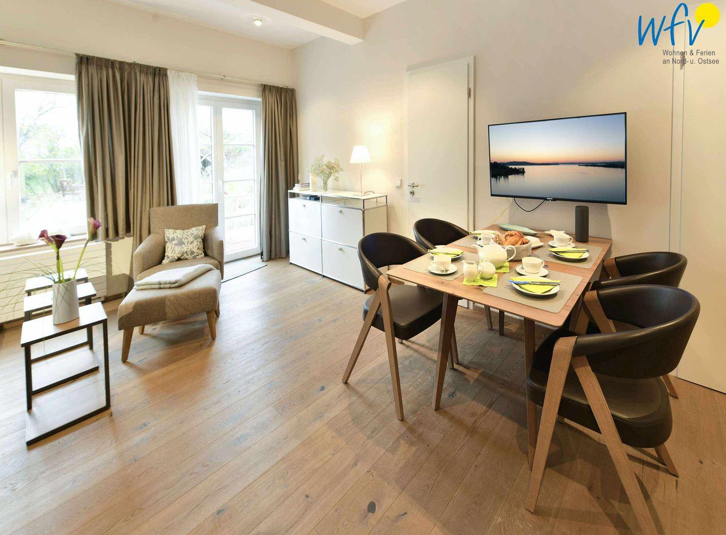 Herrlich relaxen können Sie zum Beispiel im Wohnraum der Ferienwohnung, der u.a. mit einer gemütlichen Sofaecke und einem modernem TV eingerichtet ist. Zum Surfen im Netz empfangen Sie freies WLAN. Zudem befindet sich in der Ferienwohnung eine UE Megaboom Bluetooth-Box für den Musikgenuss via Smartphone/Tablet.
