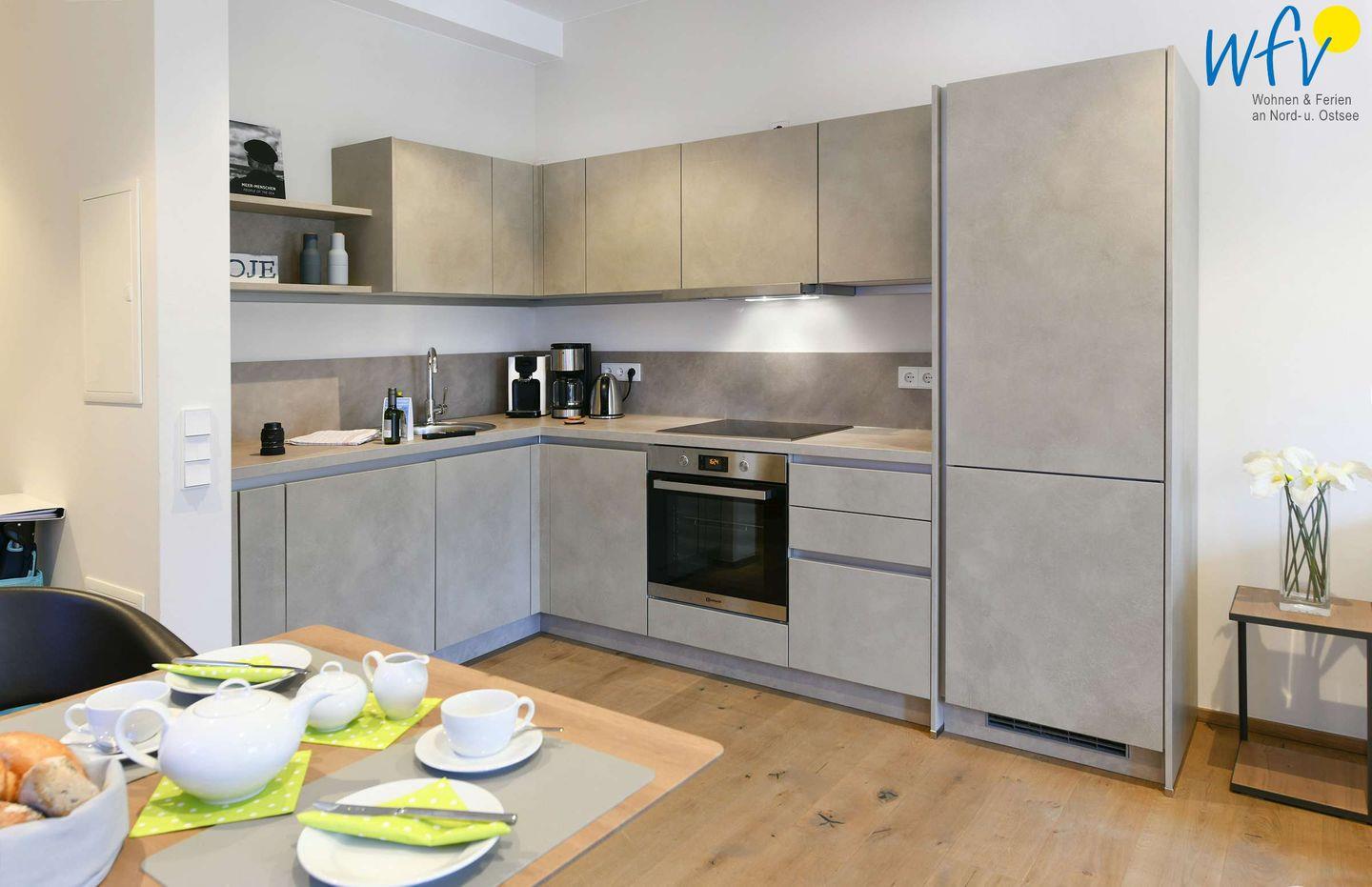 Damit Sie sich in Ihrem Urlaub auf Juist bequem selbst verpflegen können, verfügt die Küchenzeile u.a. über einen Induktionsherd, einen Backofen, einen Kühlschrank mit Gefrierfach sowie über eine Kaffeemaschine, eine Spülmaschine, einen Wasserkocher und einen Toaster. Kaffeeliebhaber können zwischen der klassischen Kaffeemaschine und einer Senseo-Pad-Maschine wählen.