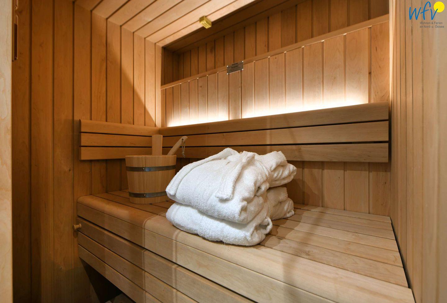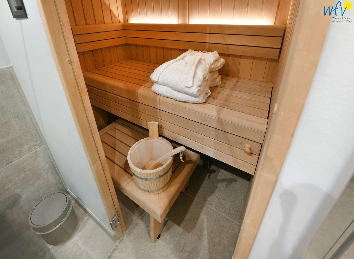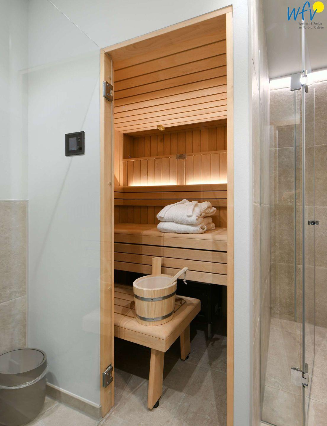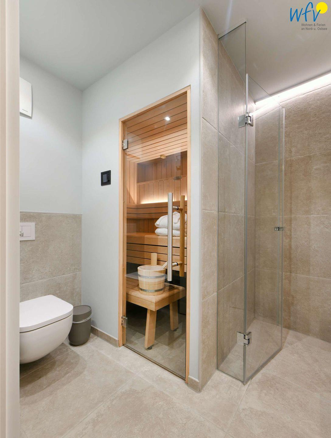Weiteren Wohnkomfort bietet Ihnen das moderne Badezimmer mit stilvoller Ausstattung, Dusche und eigener Sauna. Ideal für Entspannungsmomente nach dem Strandspaziergang!