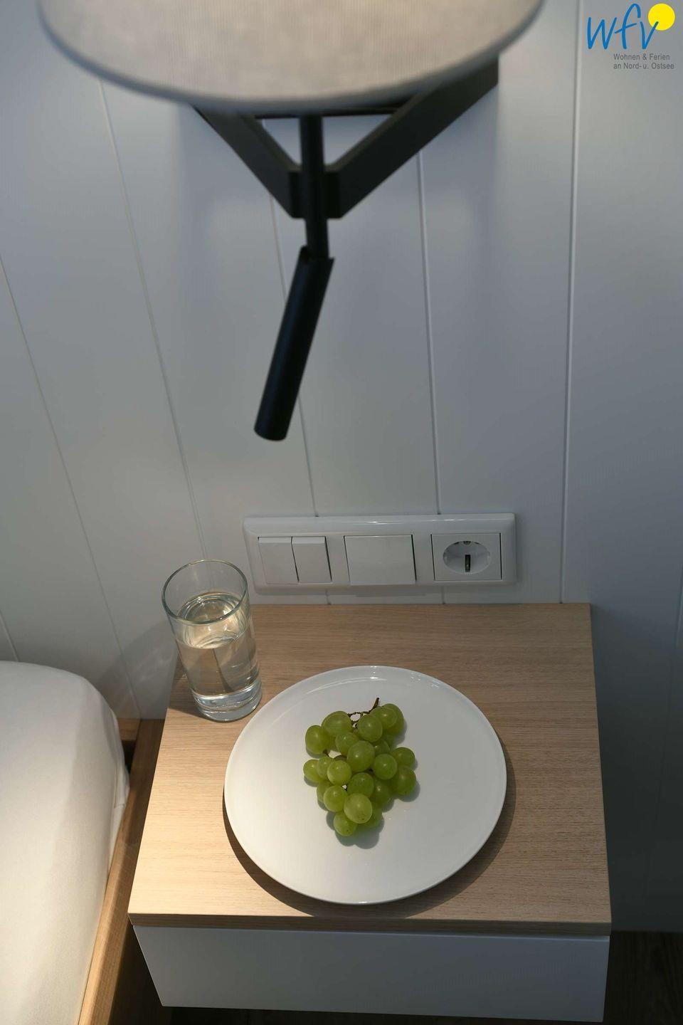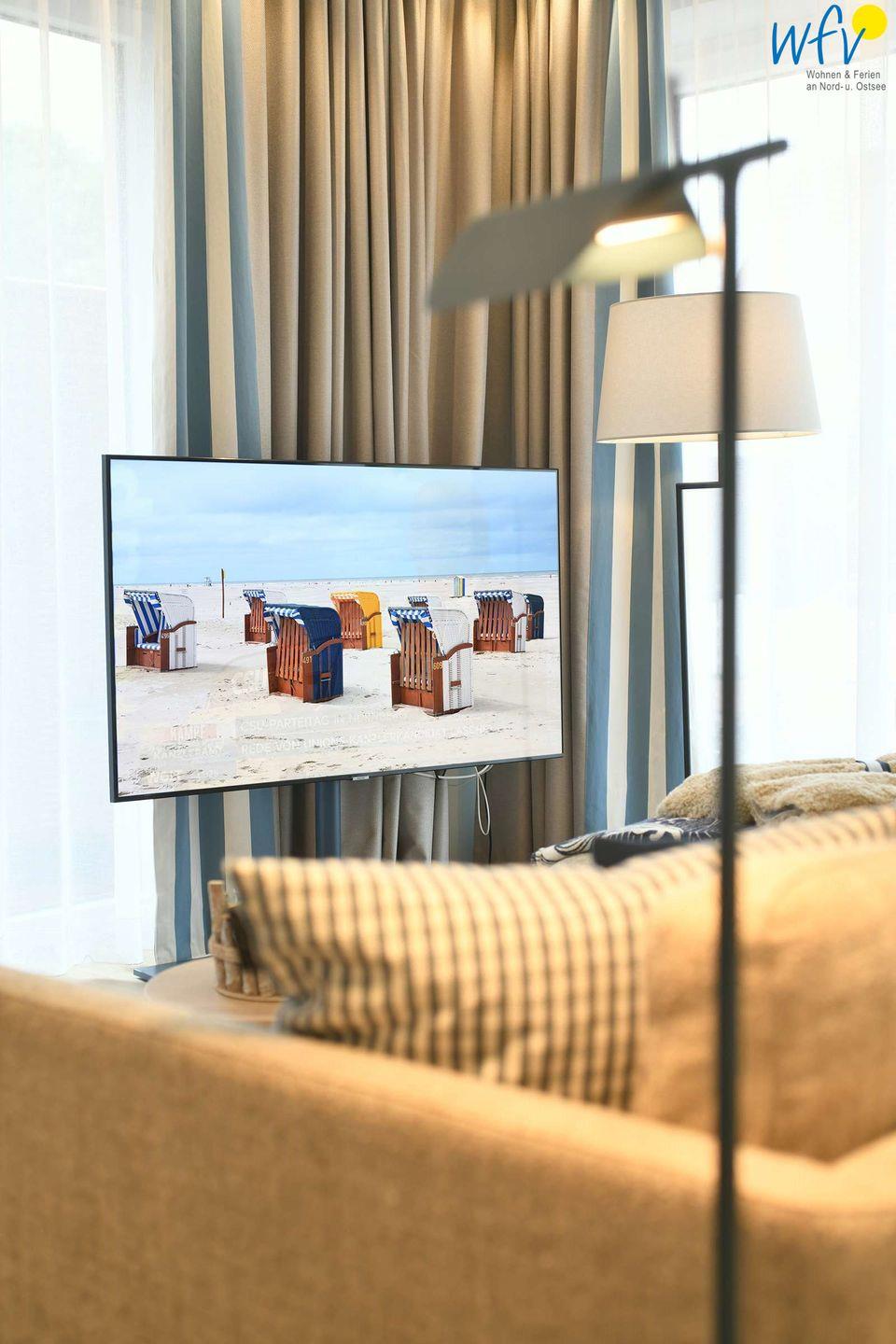 Ein gehobener Stil erwartet Sie auch in dem separaten Schlafzimmer der Ferienwohnung. Es ist mit einem komfortablen Doppelbett mit hochwertigen Matratzen (210 x 200 cm; exklusives SCHRAMM-Bettsystem plus Topper), einem Kleiderschrank und einem zusätzlichen SmartTV mit WLAN-Anschluss ausgestattet. Es bestehen gute Verdunkelungsmöglichkeiten.