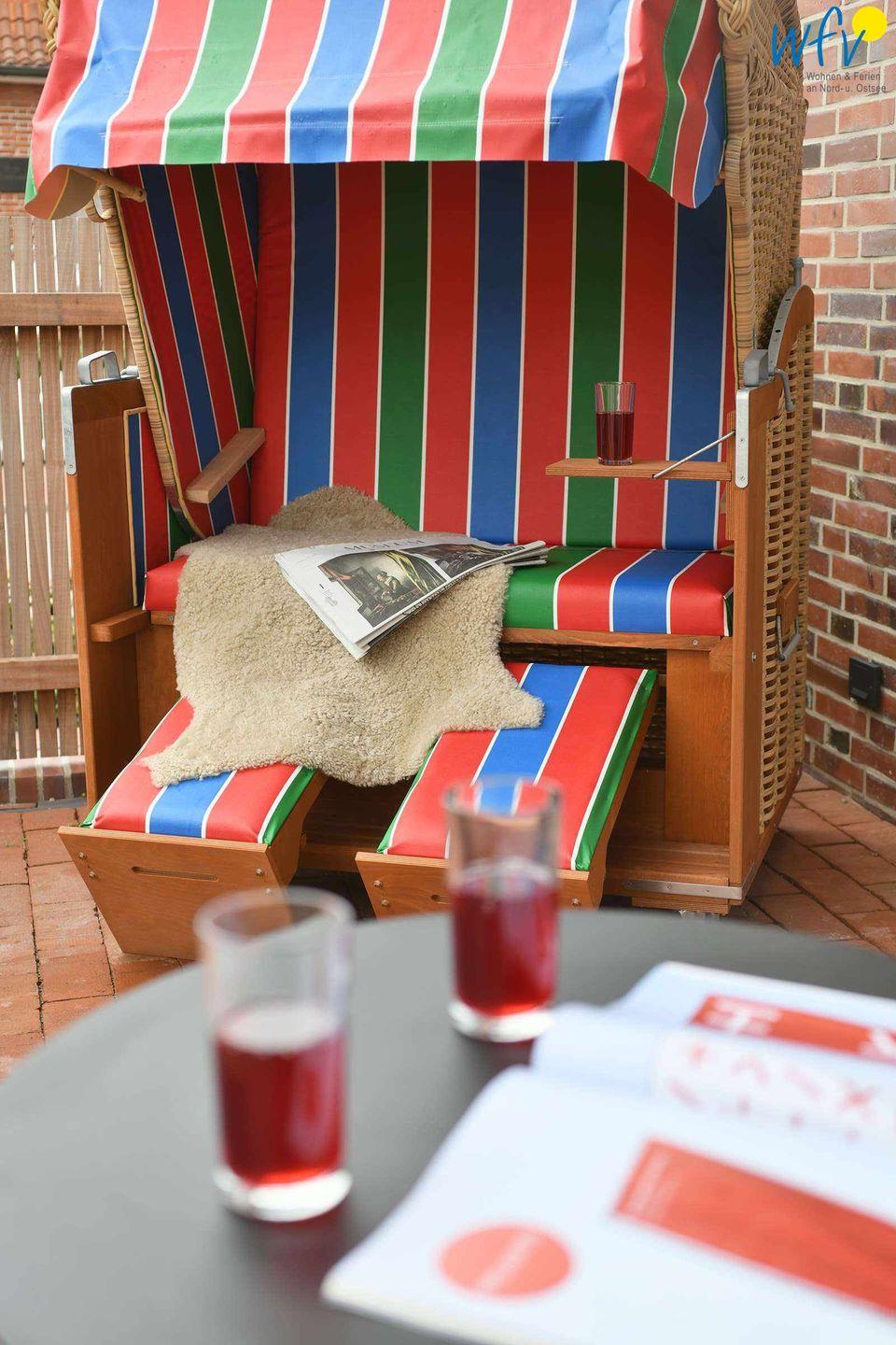 Zu wunderbaren Relaxzeiten lädt auch die 10 m² große Terrasse mit Liegestühlen, Sonnenschirm und Strandkorb ein. Mit Blick ins Grüne können Sie hier ganz in Ruhe die Sonne genießen oder bei einem guten Glas Wein die Abendröte beobachten. Das sind unvergessliche Urlaubserlebnisse auf dem schönen Töwerland.