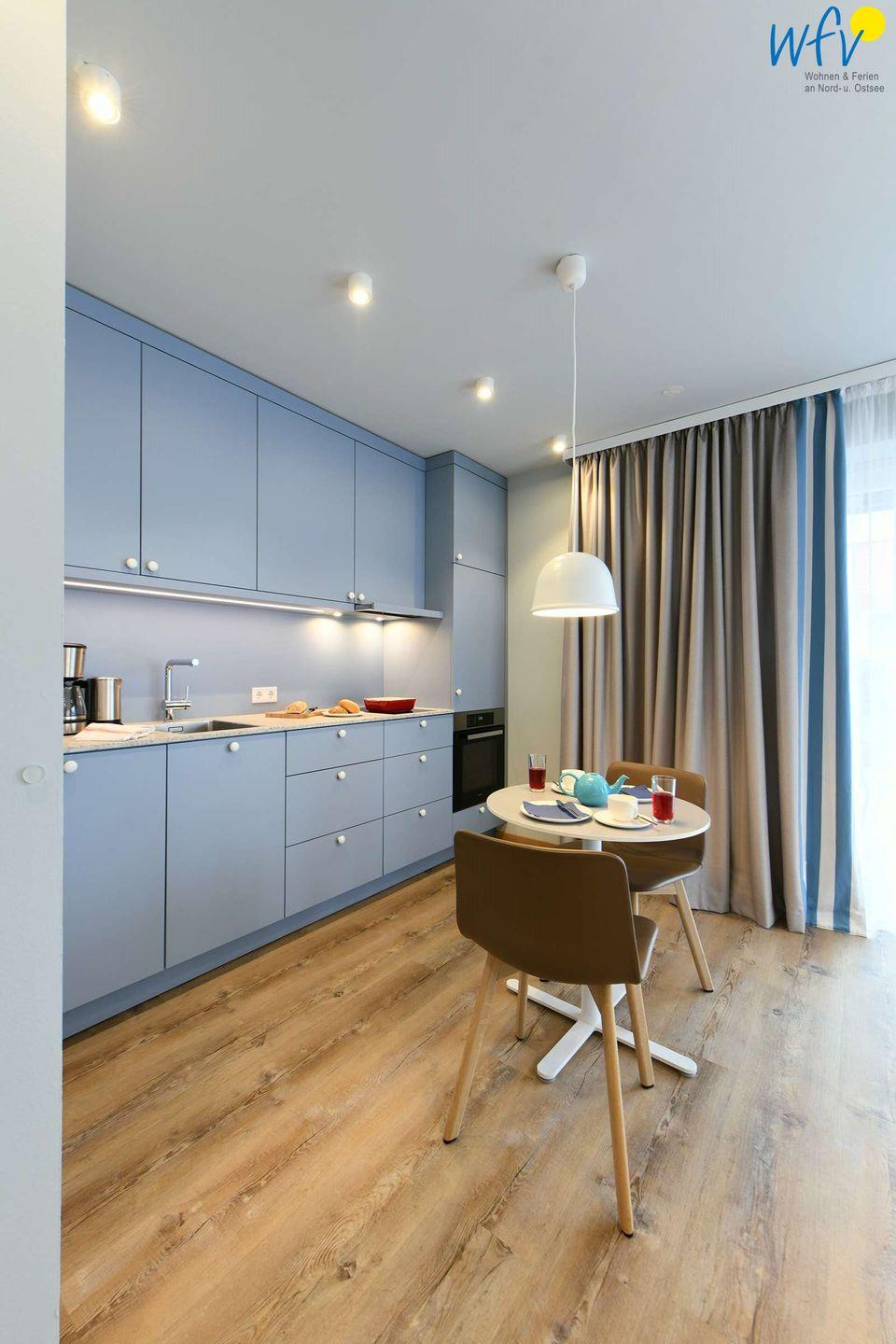Für eine bequeme Selbstverpflegung verfügt die Ferienwohnung "Robbe" über eine gut bestückte Einbauküche – u.a. mit Herd, Backofen und Spülmaschine. Zusätzlich zur Filterkaffee-Maschine ist eine NESPRESSO vorhanden. Für gemeinsame Mahlzeiten wurde eine gemütliche Essecke eingerichtet.