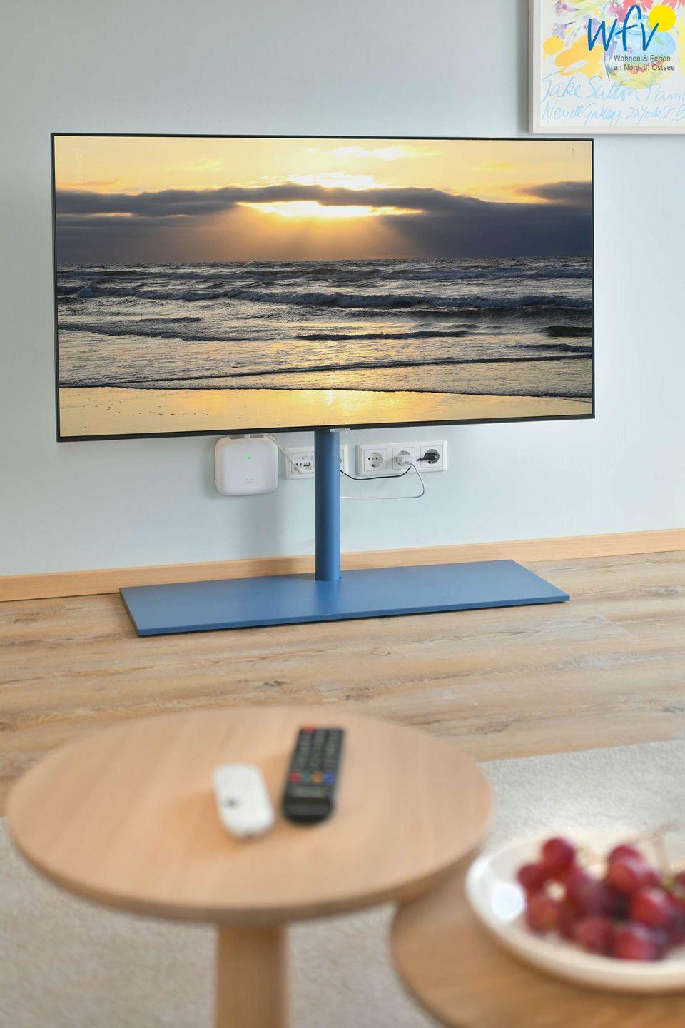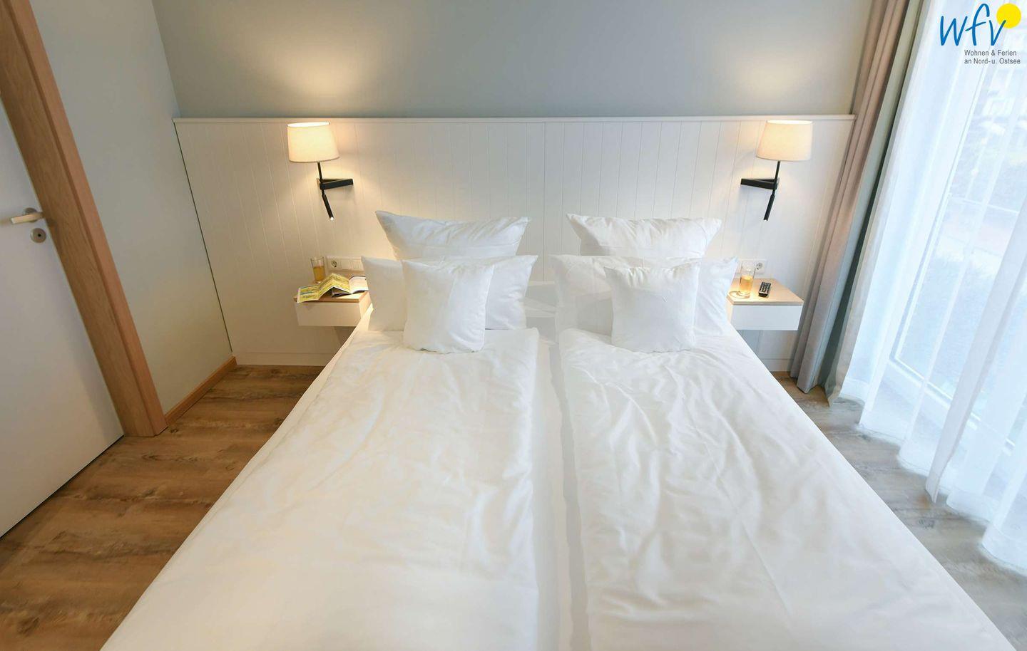 Das separate Schlafzimmer ist mit einem komfortablen Doppelbett mit hochwertigen Matratzen (210 x 200 cm; exklusives SCHRAMM-Bettsystem plus Topper) und einem zusätzlichen SmartTV mit WLAN-Anschluss ausgestattet. Es bestehen gute Verdunkelungsmöglichkeiten. Zwei weitere Schlafplätze befinden sich im Wohnzimmer auf einer gemütlichen Schlafcouch.