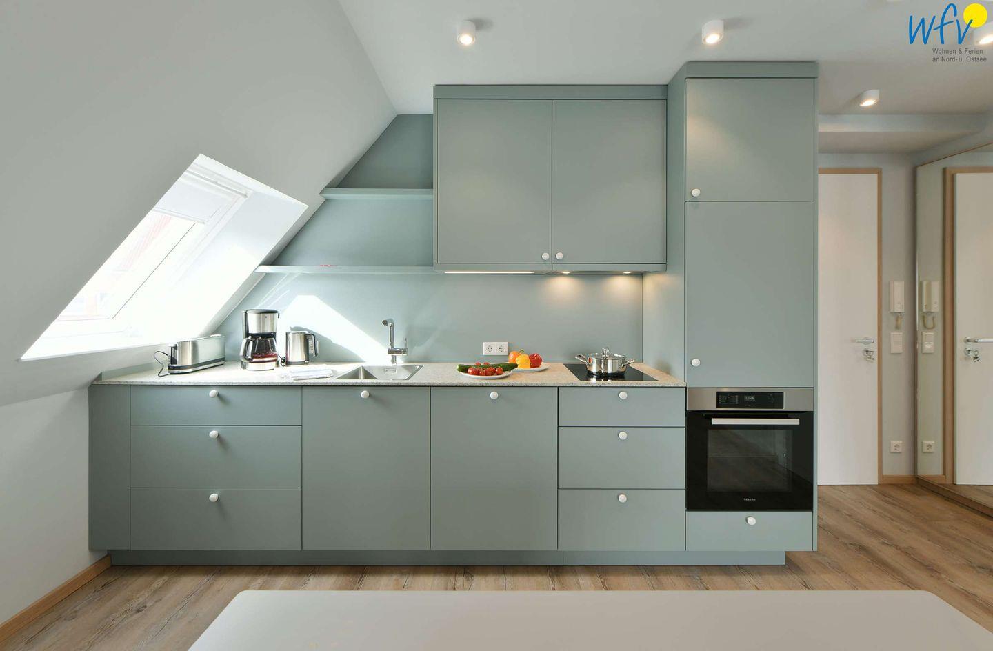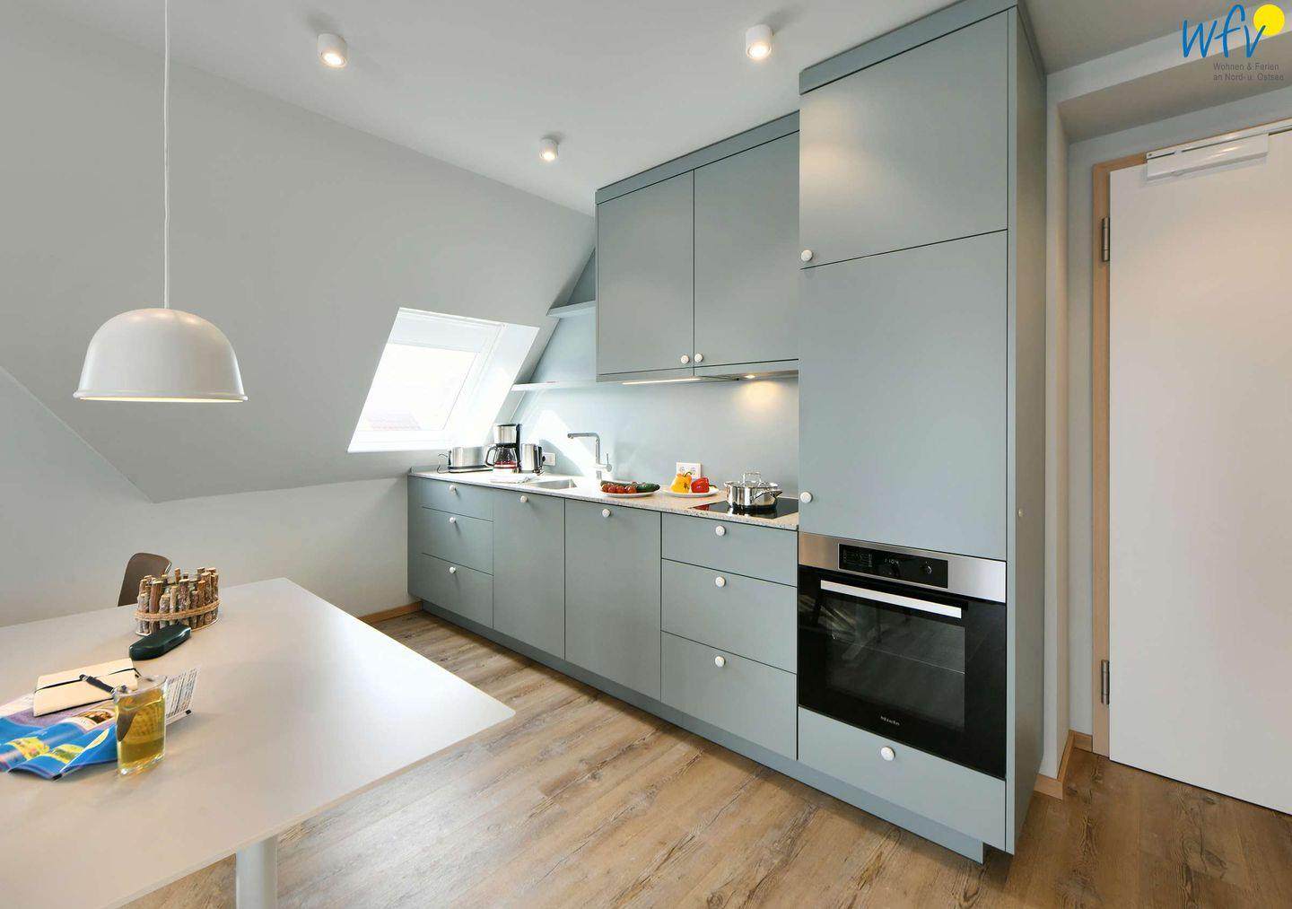 Für eine bequeme Selbstverpflegung ist die Ferienwohnung "Watt" mit einer gut bestückten Einbauküche ausgestattet – u.a. mit Herd, Backofen und Spülmaschine. Zusätzlich zur Filterkaffee-Maschine ist eine NESPRESSO vorhanden. Für gemeinsame Mahlzeiten wurde ein kleiner Essbereich eingerichtet.