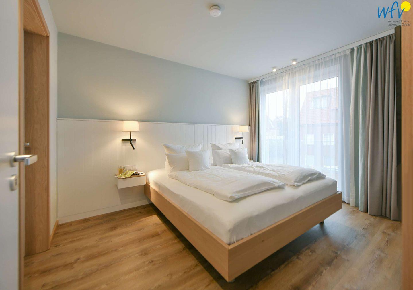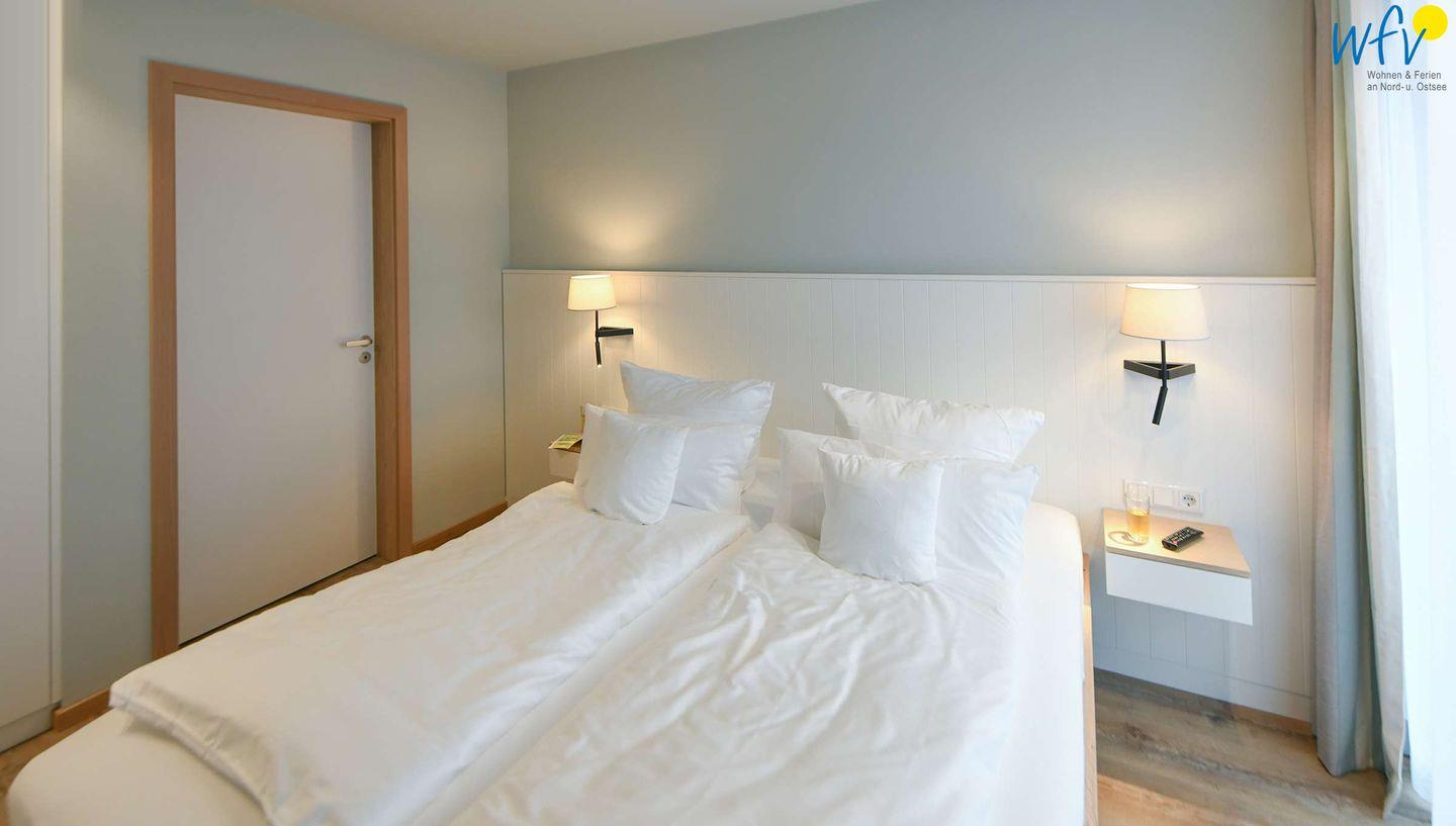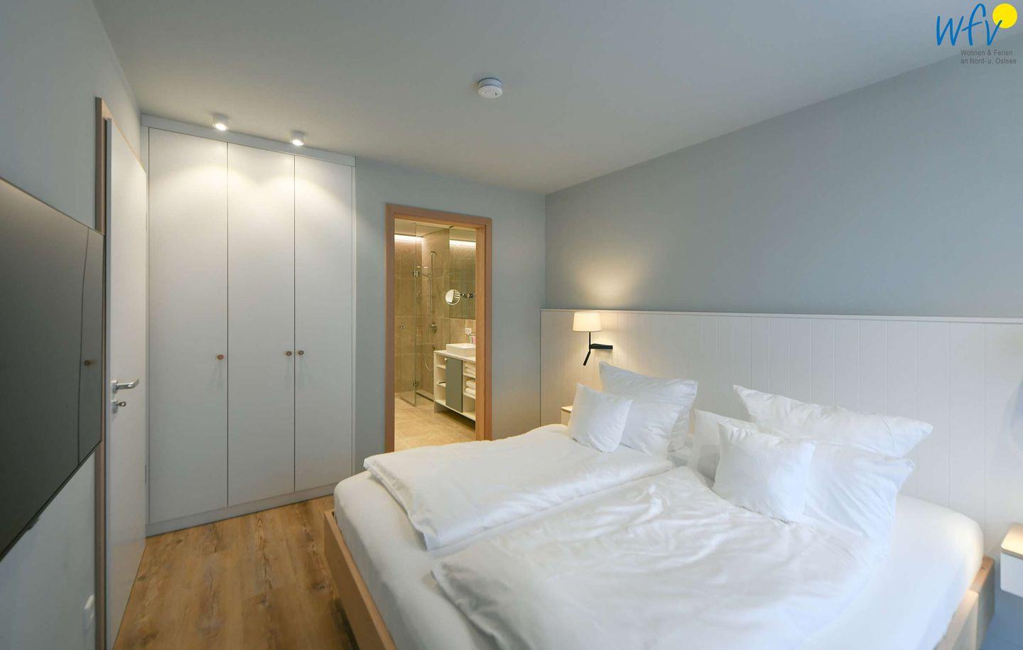 Einen gehobenen Stil finden Sie auch in den separaten Schlafzimmern der Ferienwohnungen auf Juist. Sie verfügen jeweils über ein komfortables Doppelbett mit hochwertigen Matratzen (210 x 200 cm; exklusives SCHRAMM-Bettsystem plus Topper), einen Kleiderschrank und ein SmartTV mit WLAN-Anschluss. Es bestehen gute Verdunkelungsmöglichkeiten.