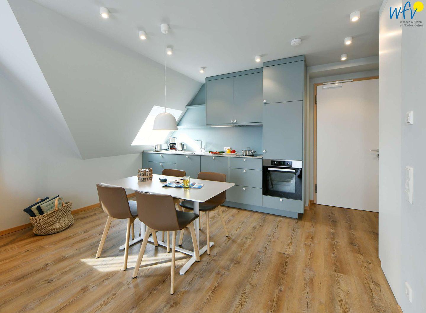 Für eine bequeme Selbstverpflegung sind die Ferienwohnungen über moderne und gut bestückte Einbauküchen ausgestattet – u.a. mit Herd, Backofen und Spülmaschine. Zusätzlich zur Filterkaffee-Maschine ist jeweils eine NESPRESSO vorhanden. Für gemeinsame Mahlzeiten wurden gemütliche Essbereiche eingerichtet.