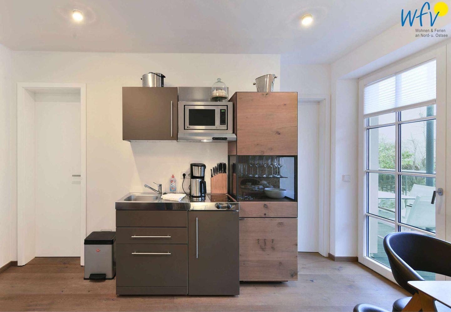 Damit Sie sich in Ihrem Urlaub auf Juist bequem selbst verpflegen können, verfügt die Küchenzeile u.a. über einen Herd mit Backofen, eine Spülmaschine, einen Kühlschrank mit Gefrierfach sowie über eine Kaffeemaschine, eine Mikrowelle und einen Wasserkocher.