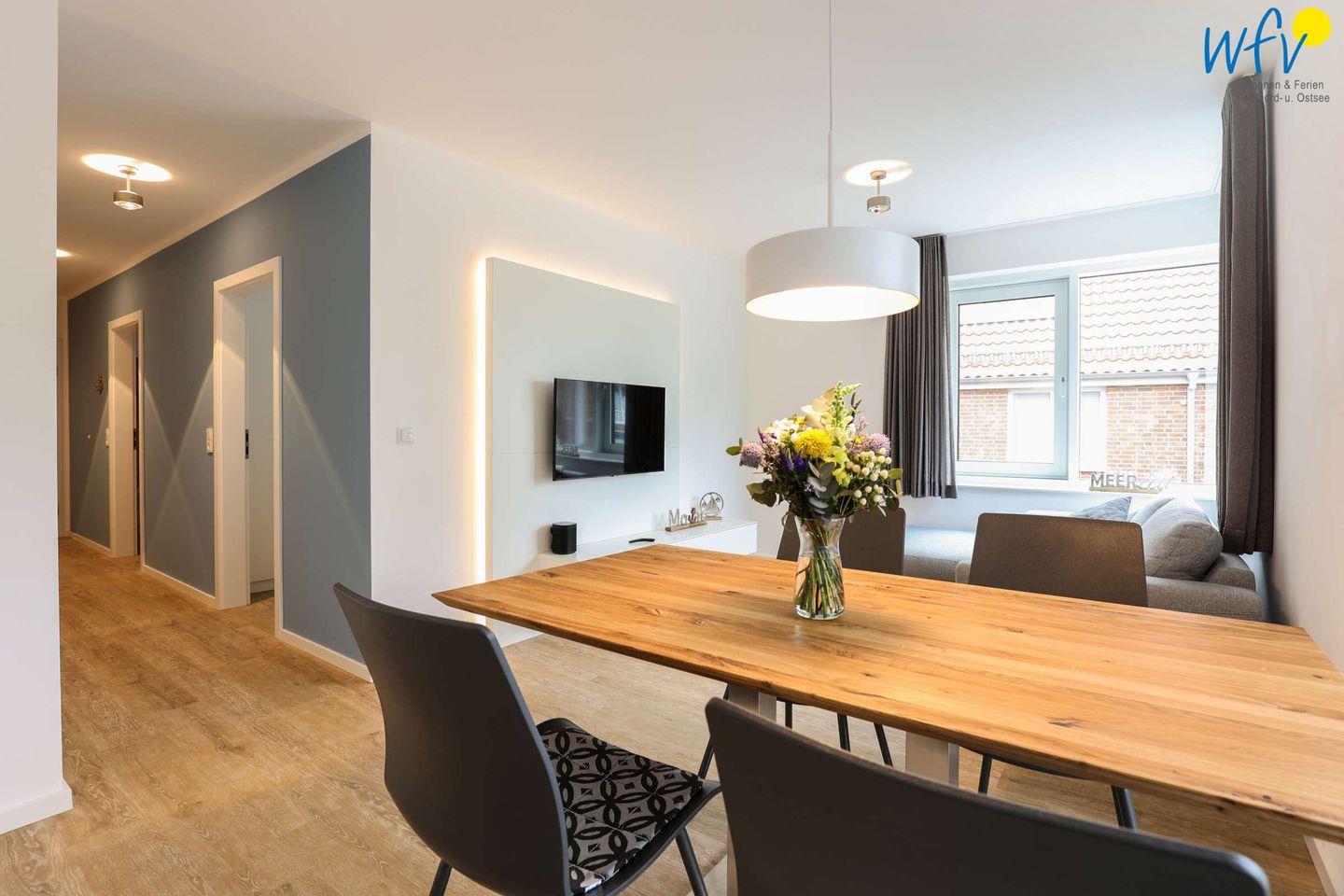 Die 58 m² große Ferienwohnung auf Juist befindet sich im 1. Obergeschoss und verfügt über zwei separate Schlafzimmer, einen großen Wohnraum mit integrierter Küche, ein modernes Duschbad und einen sonnigen Balkon. Helle Farben und ein schöner Lichteinfall verleihen der Wohnung eine sehr freundliche Atmosphäre. An kühleren Tagen sorgt eine Fußbodenheizung für wohlige Wärme in den Räumen.