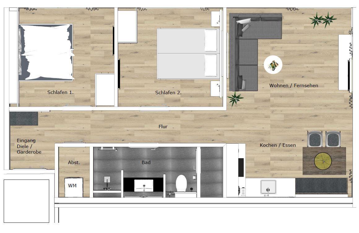 Die zwei separaten Schlafzimmer sind jeweils mit einem Doppelbett ausgestattet. In beiden Schlafräumen befindet sich außerdem ein TV. Für einen wohltuenden Schlaf bestehen Verdunkelungsmöglichkeiten.