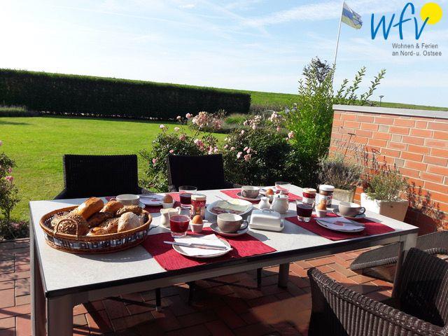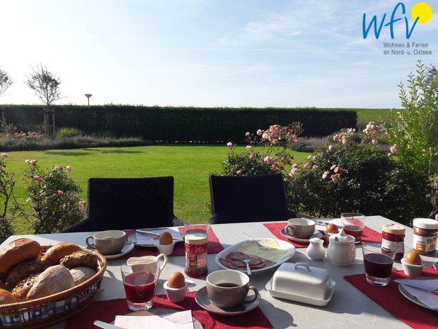 Von der Ferienwohnung aus haben Sie einen schönen Blick in den Garten und auf den Deich.