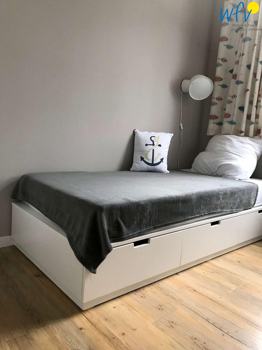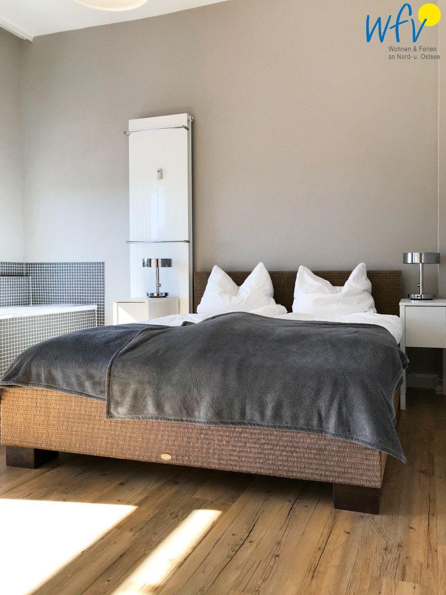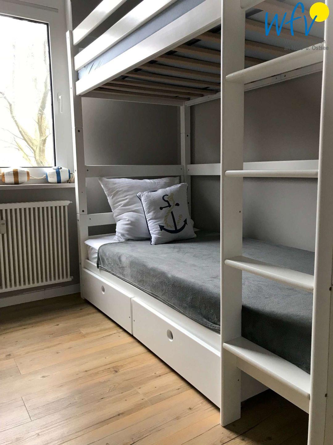 Zwei separate Schlafzimmer bieten Ihnen angenehme Rückzugsmöglichkeiten. Die Zimmer sind im Beach-House Flair mit gehobener Ausstattung eingerichtet - ein echtes Highlight! In einem der beiden Schlafzimmer befindet sich ein Doppelbett und ein Kleiderschrank sowie eine Badewanne und ein Waschbecken; direkt angrenzend ein WC. Das zweite Schlafzimmer ist mit drei Betten (einem Hochbett und einem Einzelbett) ausgestattet. Der zweite Sanitärbereich mit WC und Dusche liegt neben dem Wohnzimmer.