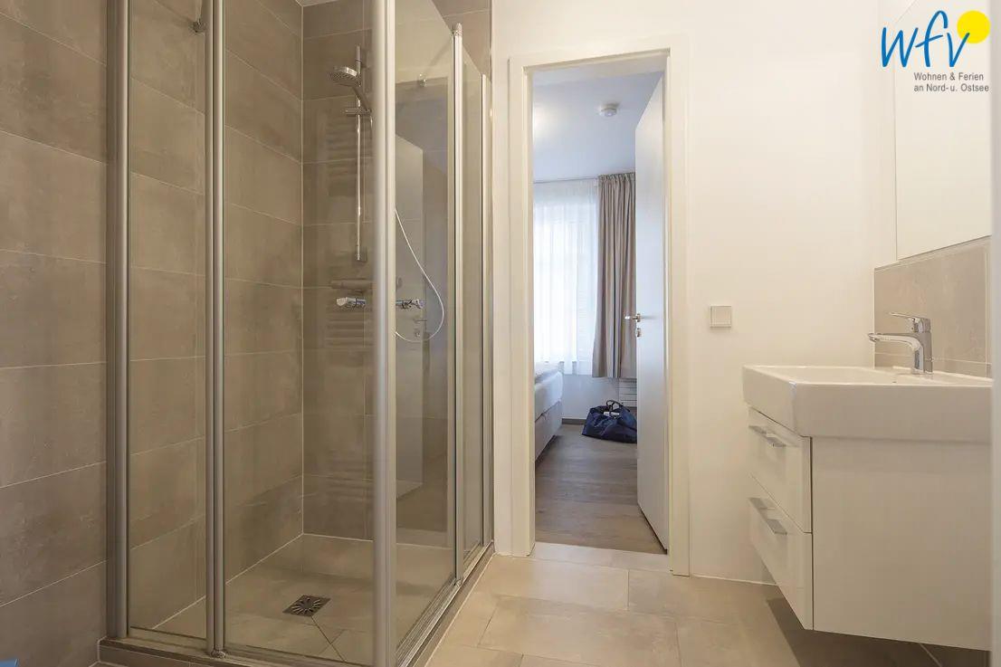 Dusche und WC befinden sich in separaten Räumen, sodass auch bei einem Aufenthalt mit mehreren Personen gute Ausweichmöglichkeiten bestehen. Das Duschbad ist sowohl vom Flur, als auch vom größeren Schlafzimmer aus begehbar.