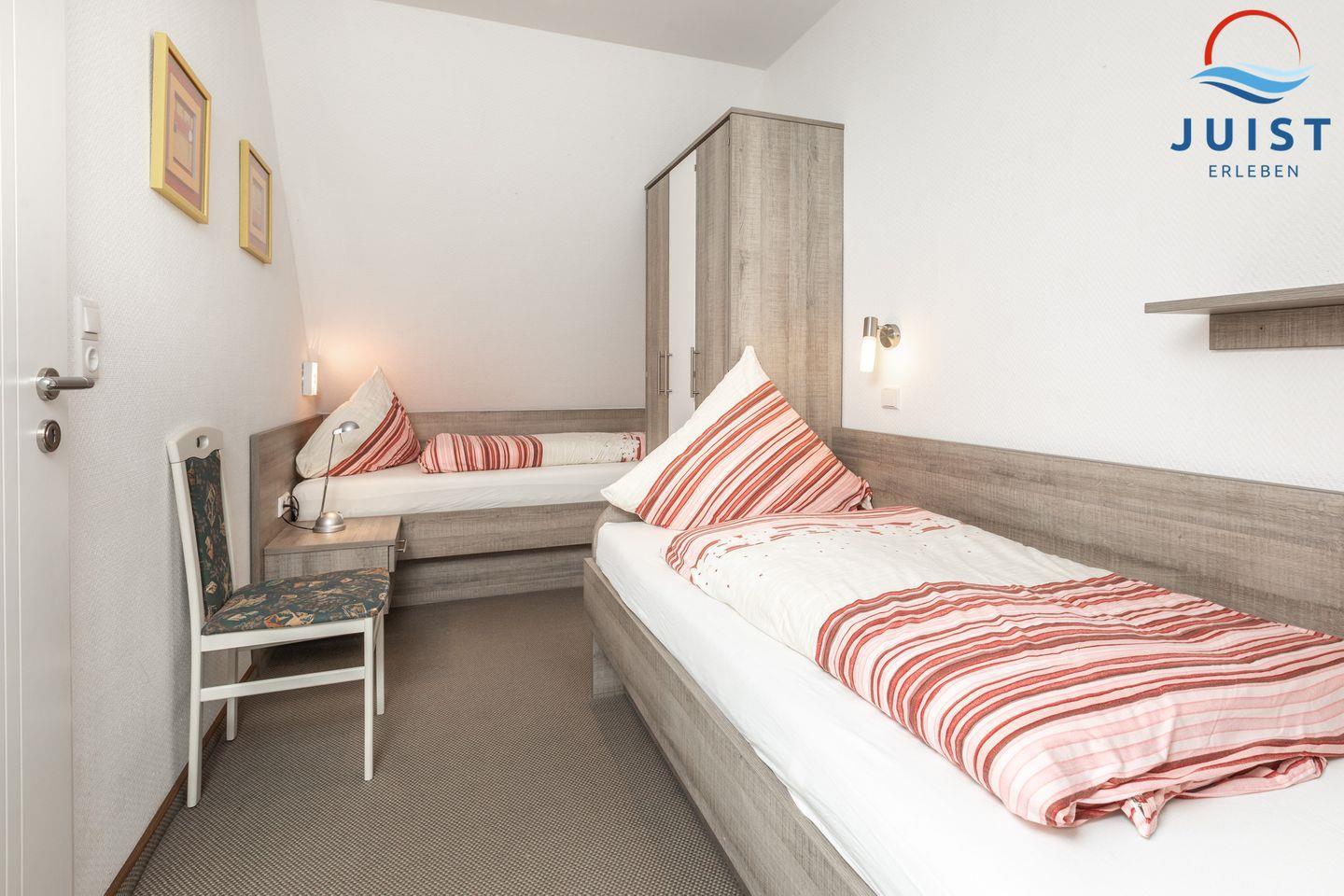 In der 2 Etage befinden sich die 2 separaten Schlafzimmer. Diese sind jeweils mit 2 Einzelbetten sowie Kleiderschränken eingerichtet. Die Betten lassen sich nicht zusammenschieben.