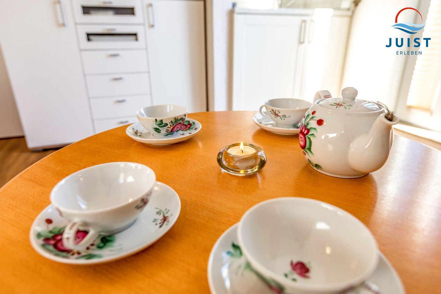 Damit Sie sich in Ihrem Urlaub auf Juist bequem selbst verpflegen können, verfügt die Küchenzeile u.a. über einen Herd, einen Kühlschrank und eine Mikrowelle sowie über eine Kaffeemaschine, einen Wasserkocher und einen Toaster.